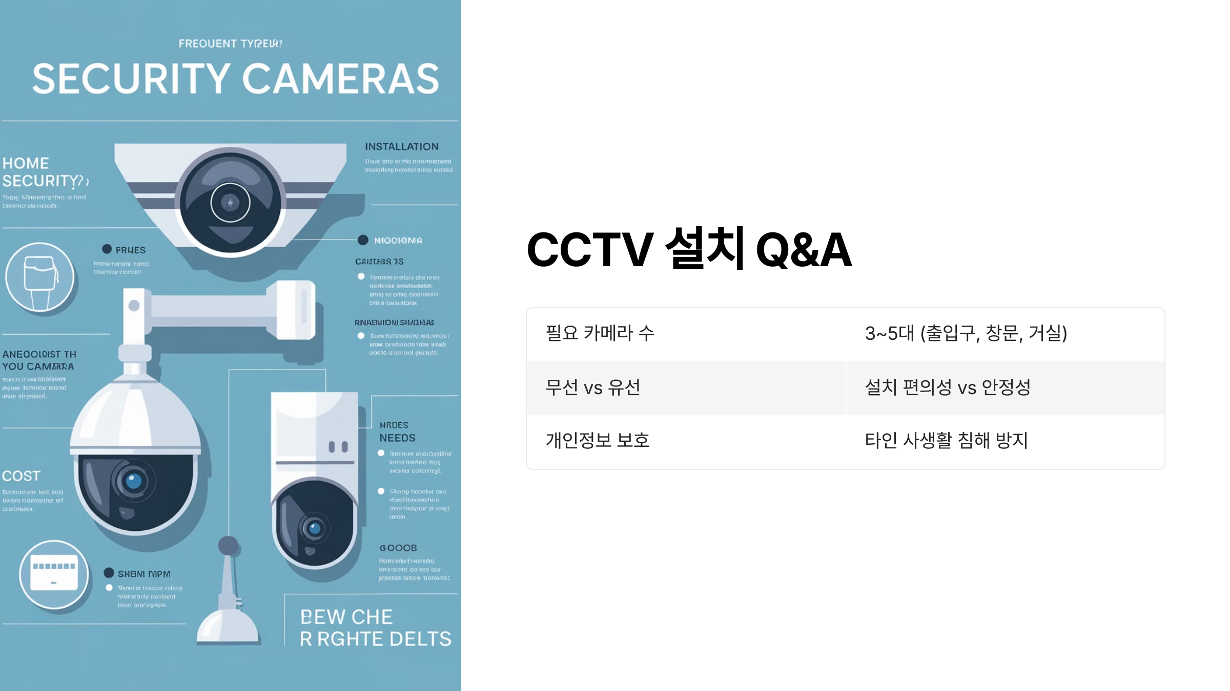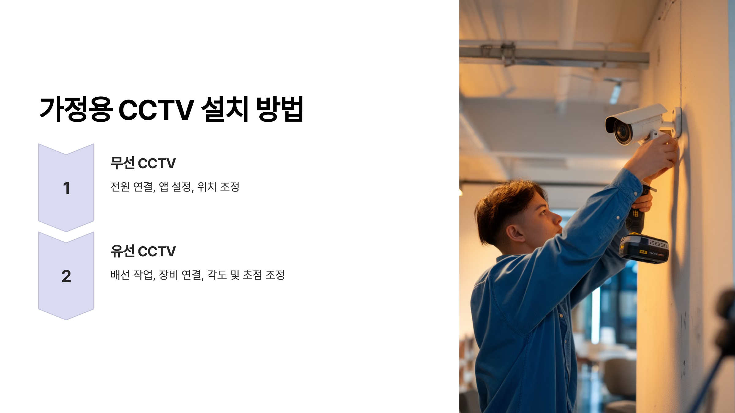 - 무선 CCTV는 설치가 간편하고 이동이 가능하며, 유선 CCTV는 안정적인 연결과 더 나은 영상 품질을 제공합니다. 필요에 따라 선택하세요.