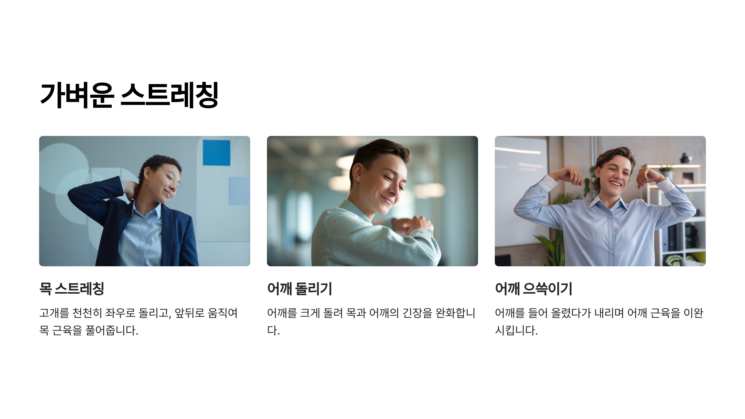 - 목 스트레칭: 고개를 천천히 좌우로 돌리고, 앞뒤로 움직여 목 근육을 풀어줍니다.