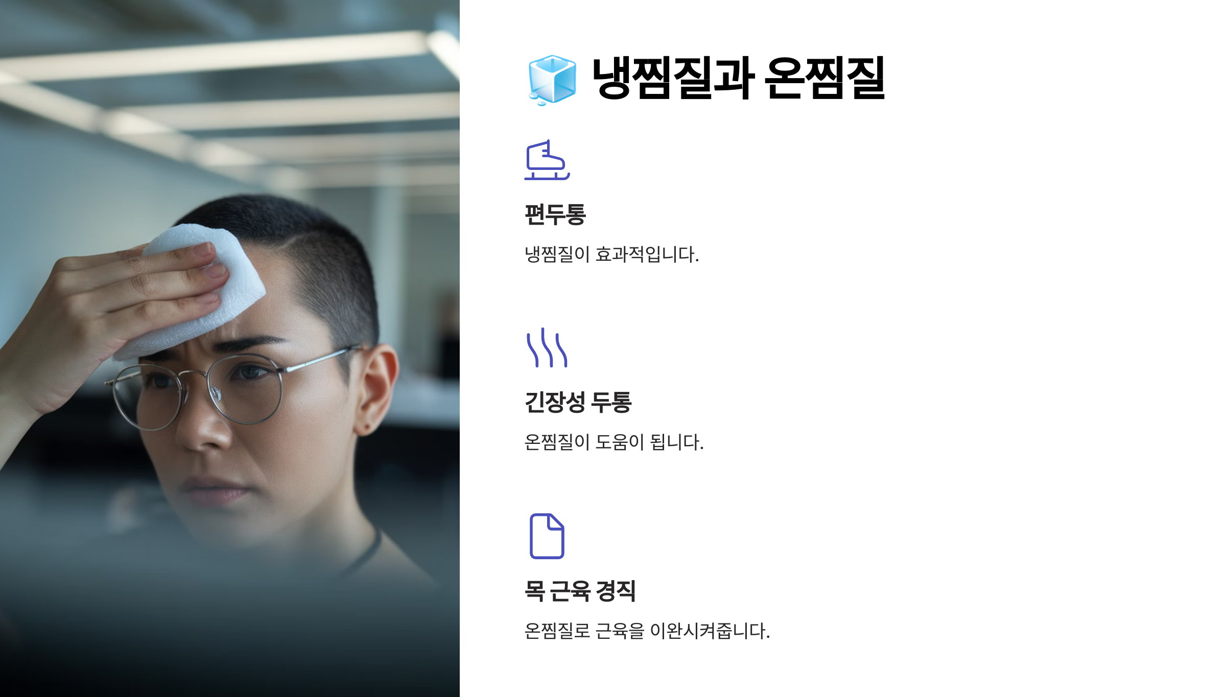 두통의 유형에 따라 냉찜질과 온찜질을 번갈아 시도할 수 있습니다. 편두통의 경우 냉찜질이 좋으며, 긴장성 두통이나 목 근육의 경직으로 인한 두통에는 온찜질이 효과적입니다.