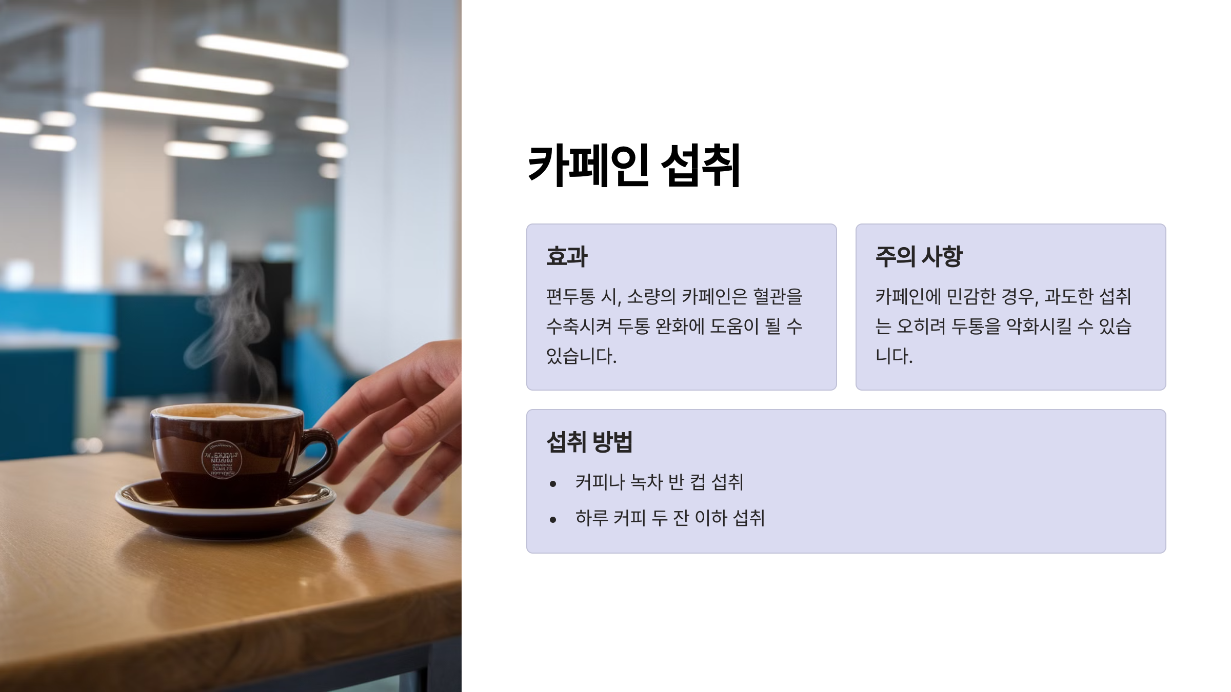 편두통인 경우, 소량의 카페인은 혈관을 수축시키는 효과가 있어 두통을 줄일 수 있습니다. 다만, 카페인에 민감한 사람은 조심해야 하며, 과도한 카페인 섭취는 오히려 두통을 악화시킬 수 있습니다.