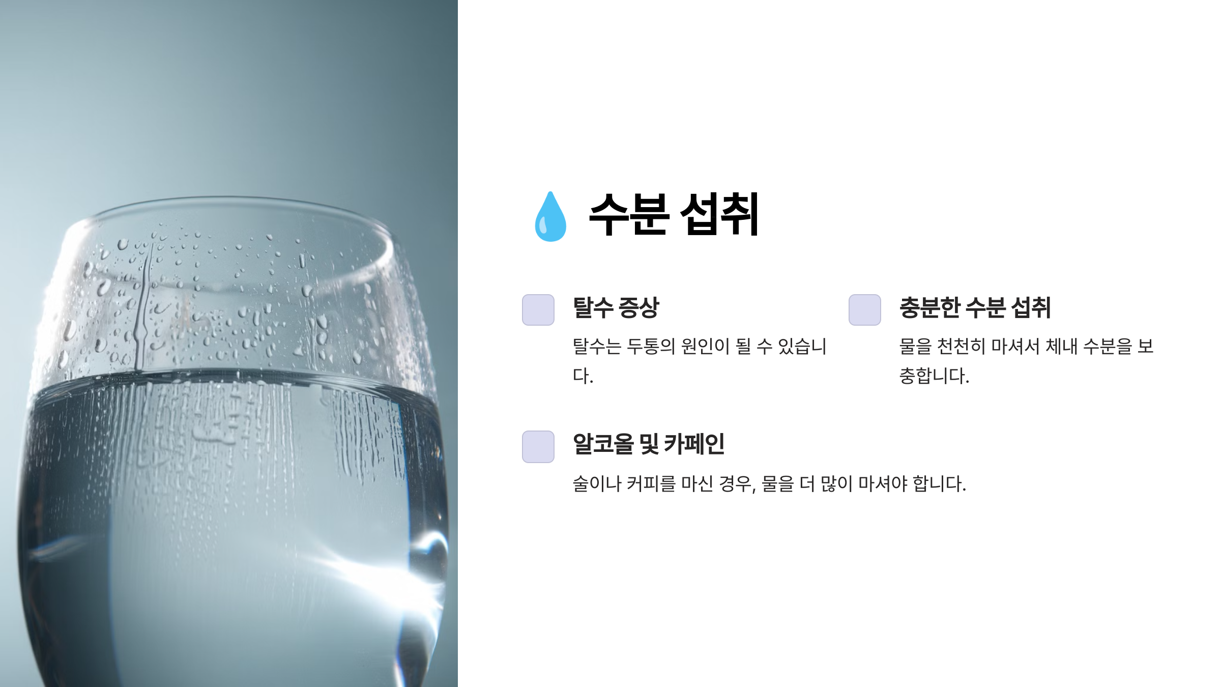 탈수로 인해 두통이 발생할 수 있으므로, 물을 천천히 마셔서 체내 수분을 보충합니다. 특히 술을 마셨거나 커피를 과도하게 섭취한 경우, 물을 충분히 마셔야 합니다.