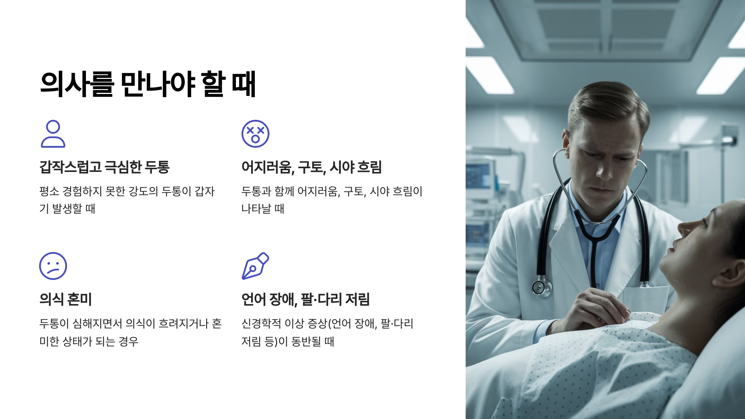 - 갑작스럽고 극심한 두통: 평소 경험하지 못한 강도의 두통이 갑자기 발생할 때