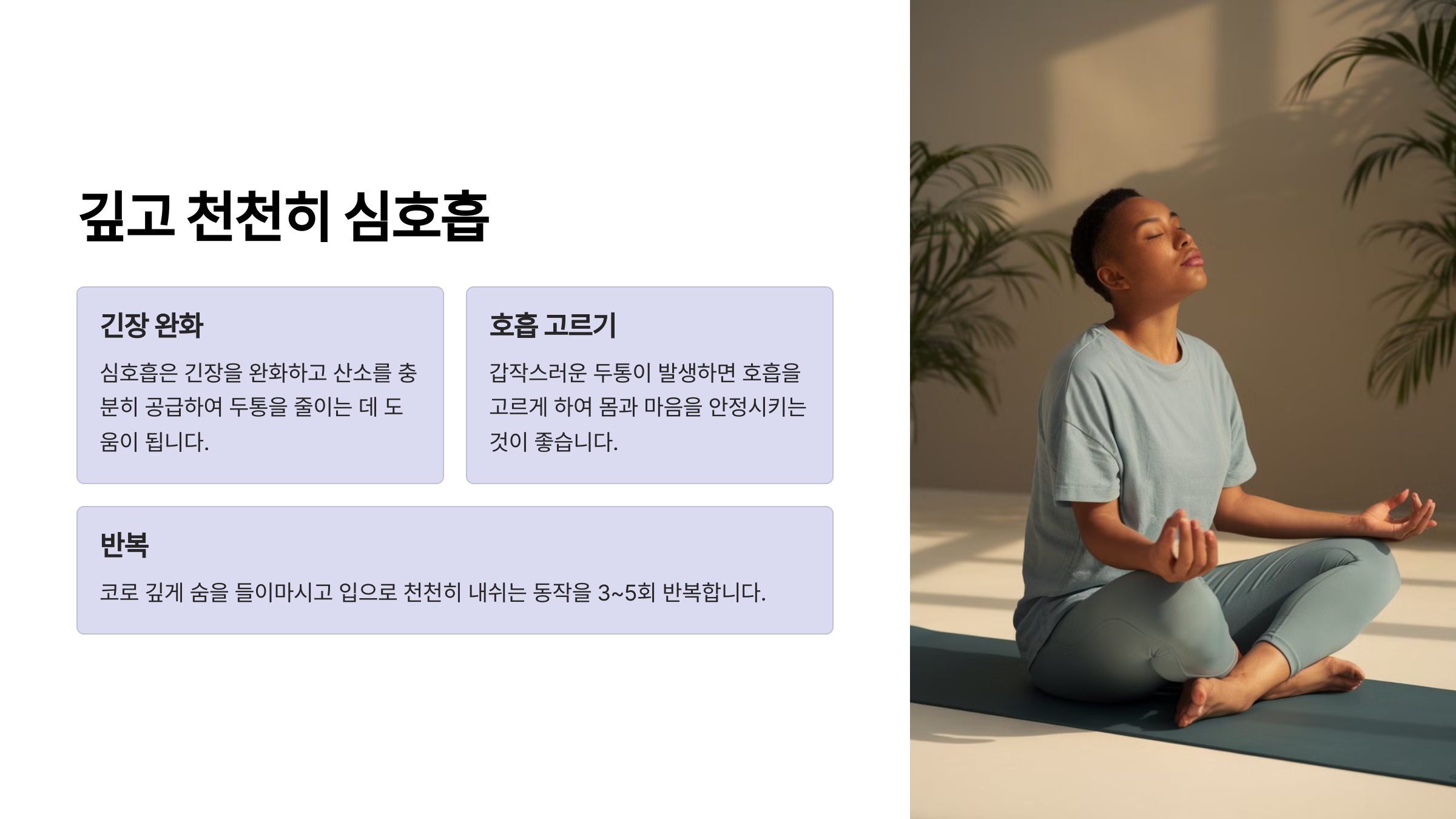 심호흡은 긴장을 완화하고 산소를 충분히 공급하여 두통을 줄이는 데 도움이 됩니다. 갑작스러운 두통이 발생하면 호흡을 고르게 하여 몸과 마음을 안정시키는 것이 좋습니다.