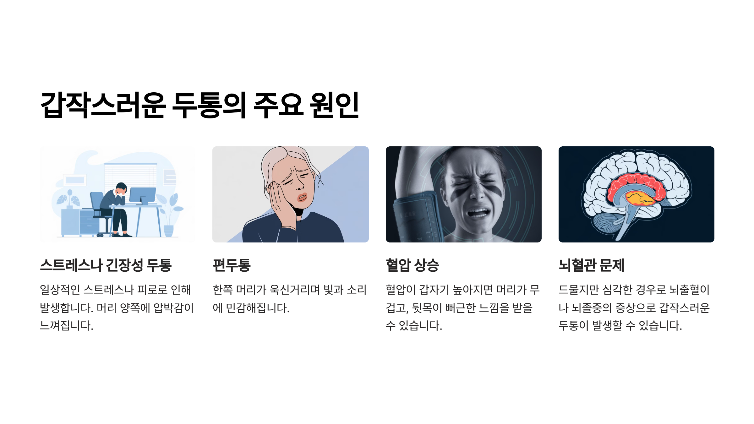 - 뇌혈관 문제: 드물지만 심각한 경우로 뇌출혈이나 뇌졸중의 증상으로 갑작스러운 두통이 발생할 수 있습니다.