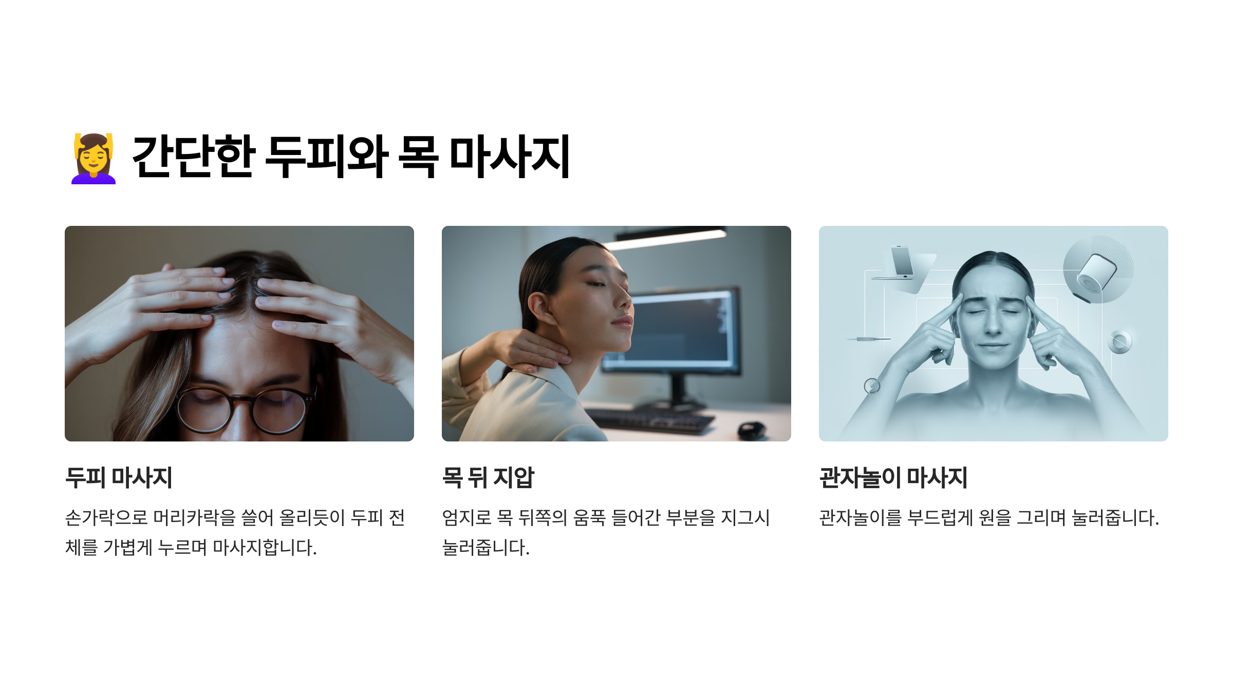 두피와 목을 부드럽게 마사지하면 혈액 순환을 개선하고 근육을 풀어주어 두통을 완화할 수 있습니다. 특히 긴장성 두통에 효과적입니다.
