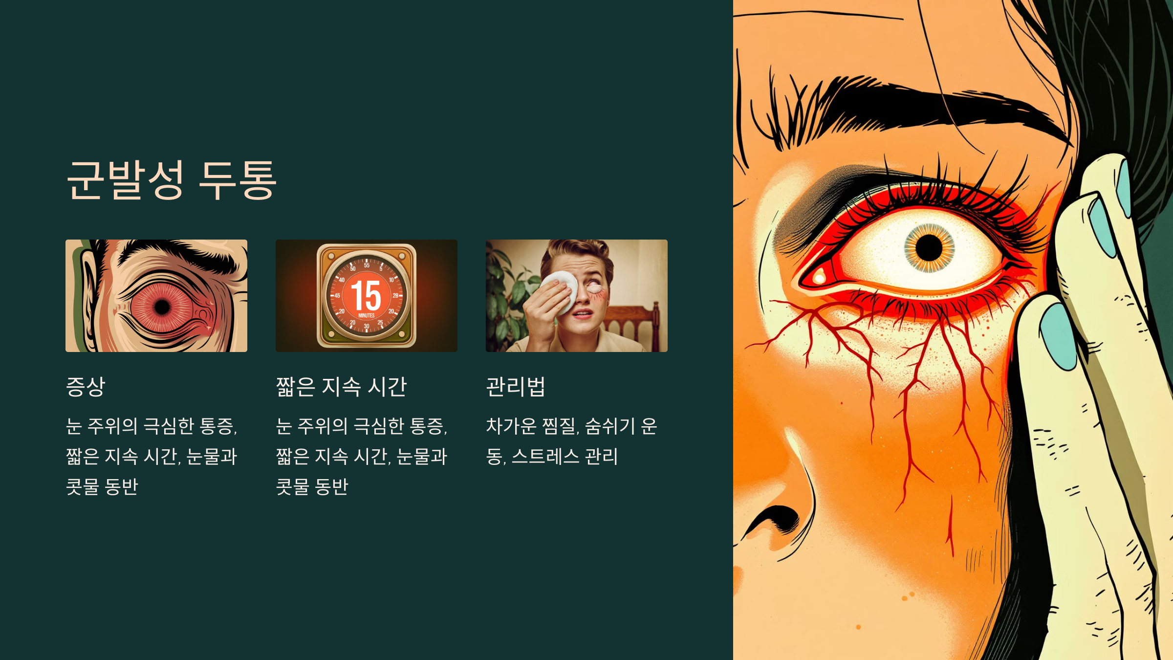 - 눈 주위의 극심한 통증: 눈 주위나 얼굴 한쪽에서 시작되는 날카로운 통증이 특징입니다.