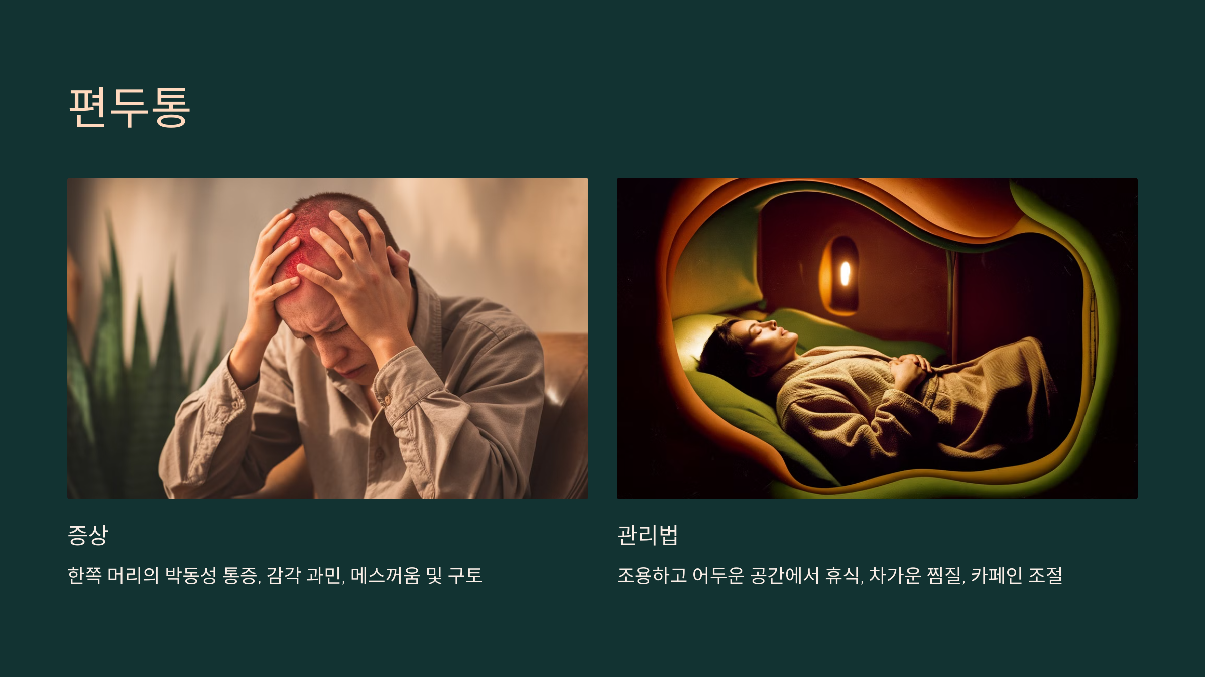 편두통은 한쪽 머리에서 주로 발생하며, 빛과 소리에 민감해지고 메스꺼움이 동반될 수 있는 심한 두통입니다. 편두통은 신경계 이상으로 발생하는 것으로 알려져 있습니다.