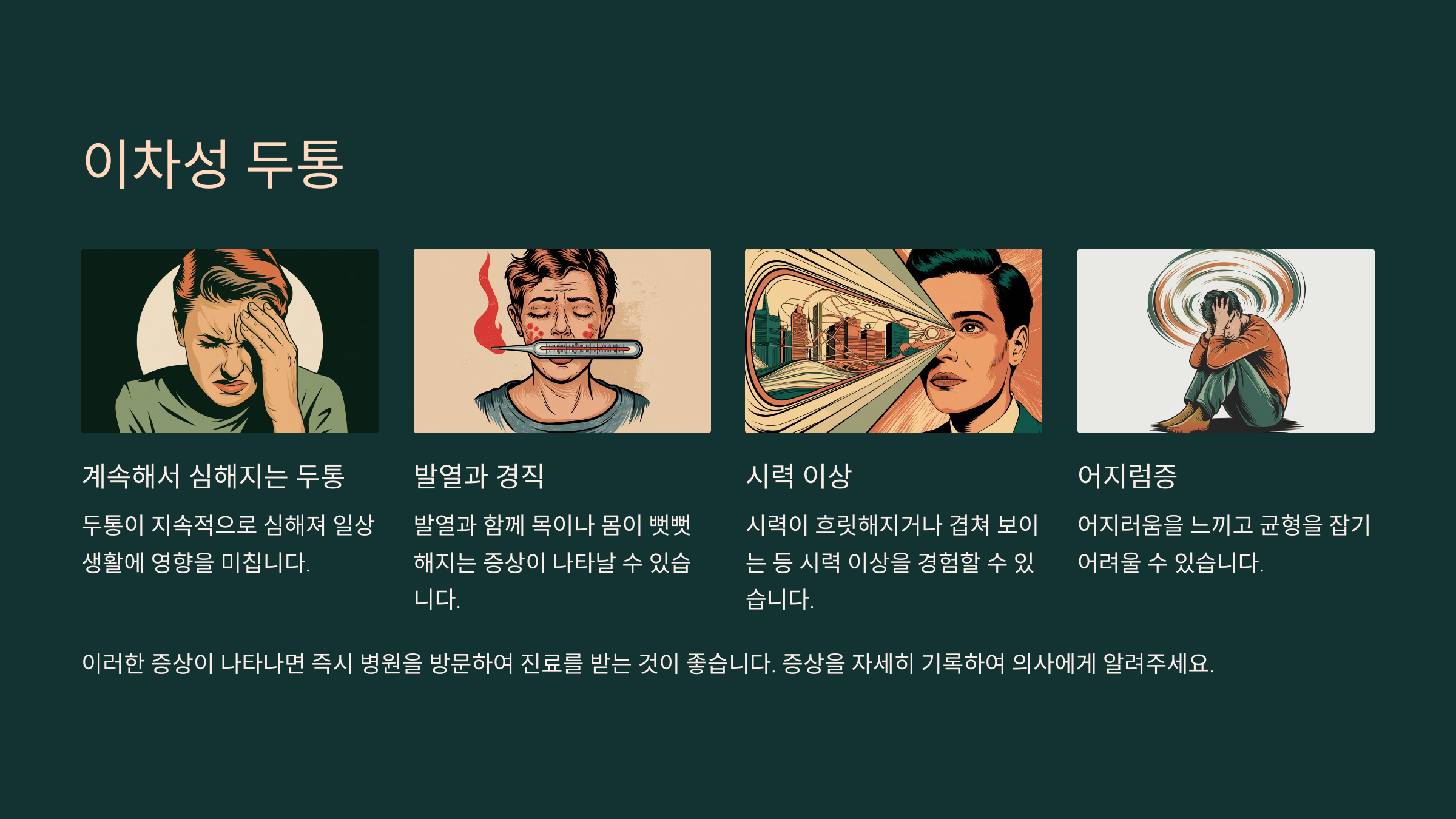 - 병원 방문: 이차성 두통은 반드시 전문가의 진단이 필요합니다. 두통이 급격히 심해지거나, 평소와 다른 증상이 나타난다면 즉시 병원을 방문하는 것이 좋습니다.