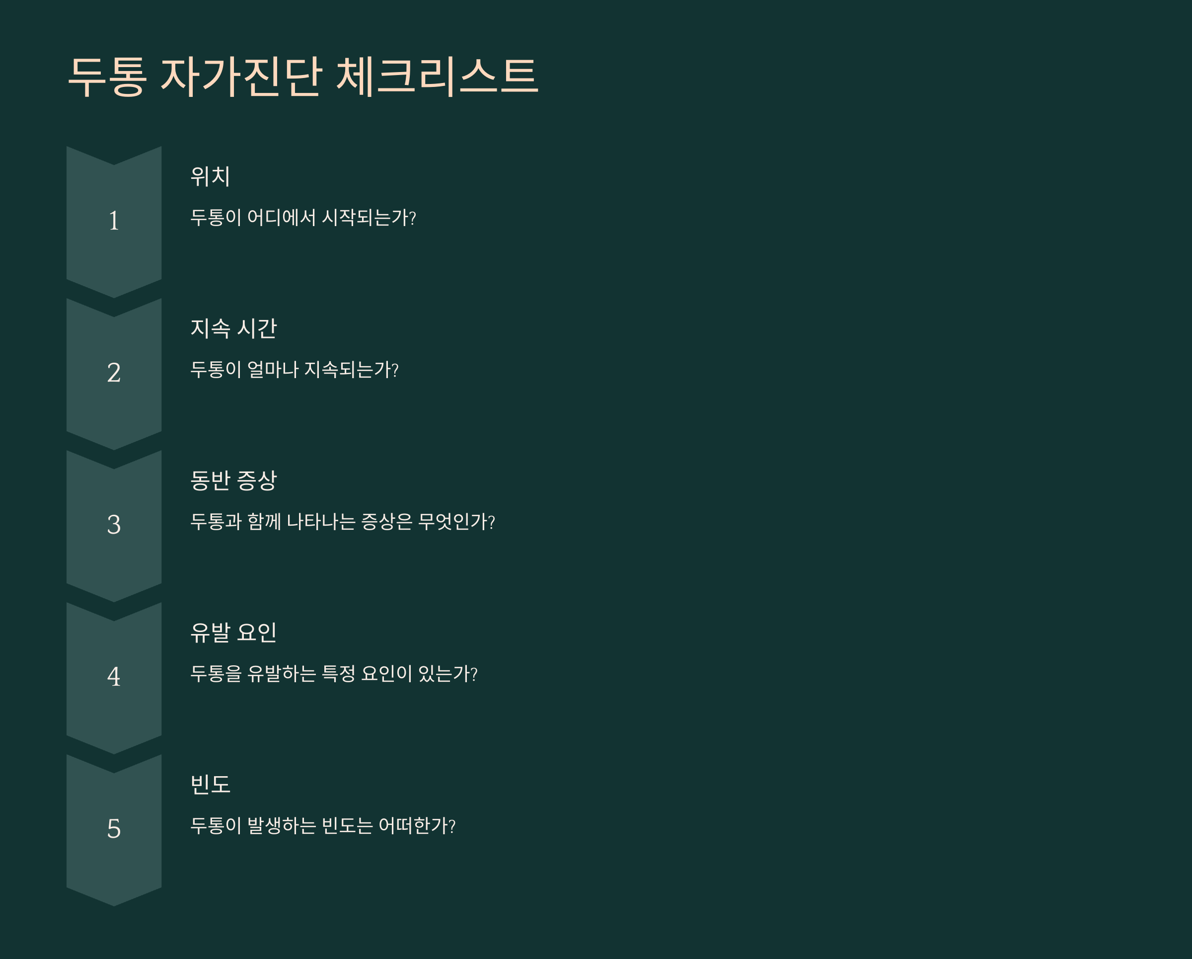 이러한 체크리스트를 통해 자신의 두통 유형을 파악하는 데 도움이 됩니다. 만약 두통이 잦거나 강도가 심해진다면 병원을 방문하여 전문 진단을 받는 것이 필요합니다.