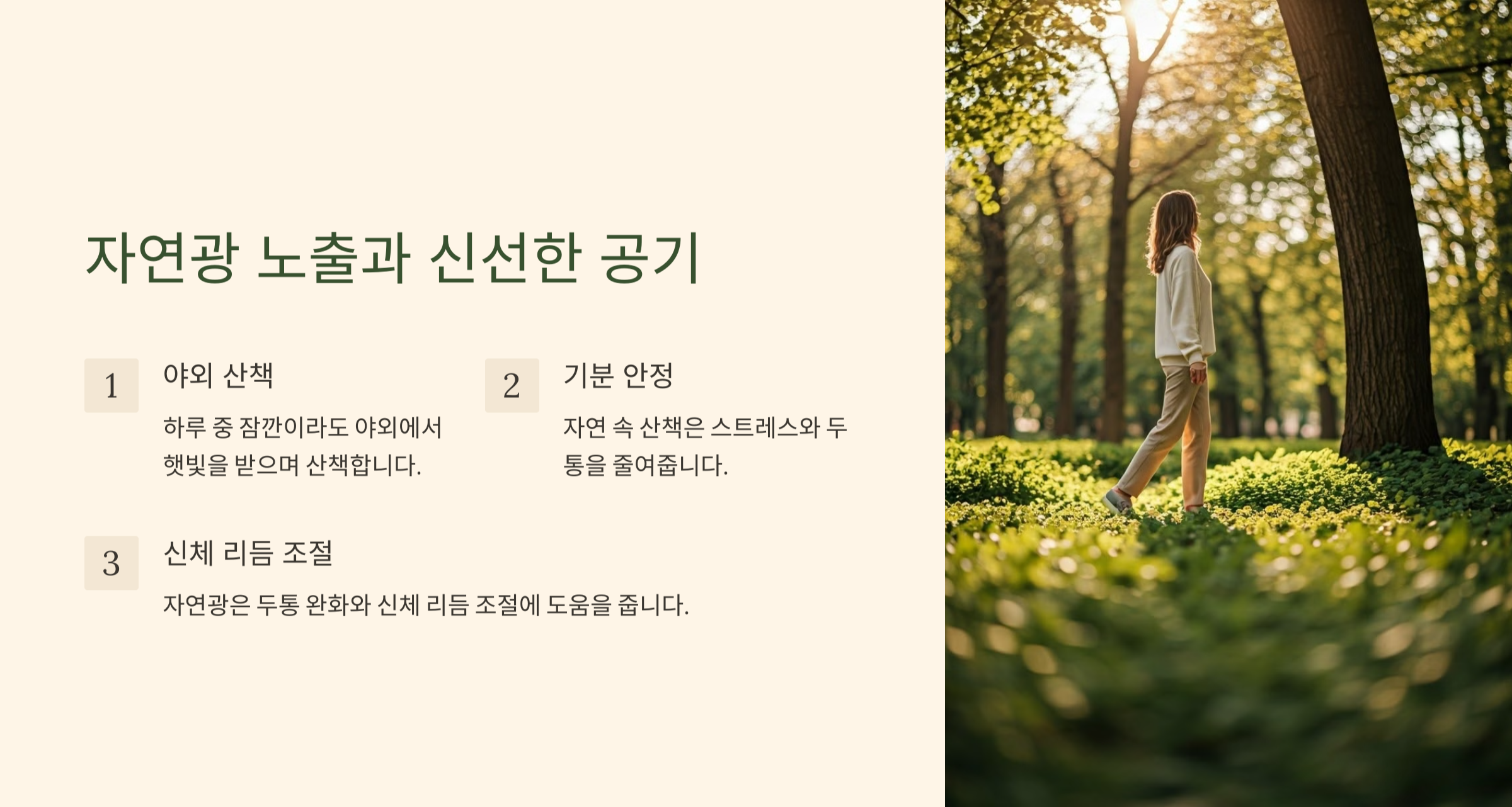 신선한 공기와 자연광은 기분을 좋게 하고 두통을 완화하는 데 효과적입니다. 하루 중 잠깐이라도 야외에서 햇빛을 받으며 산책을 해 보세요. 산책은 기분을 안정시키고 스트레스와 두통을 줄여줍니다. 특히, 자연 속에서의 짧은 산책은 두통 완화와 신체 리듬 조절에 긍정적인 영향을 줍니다.