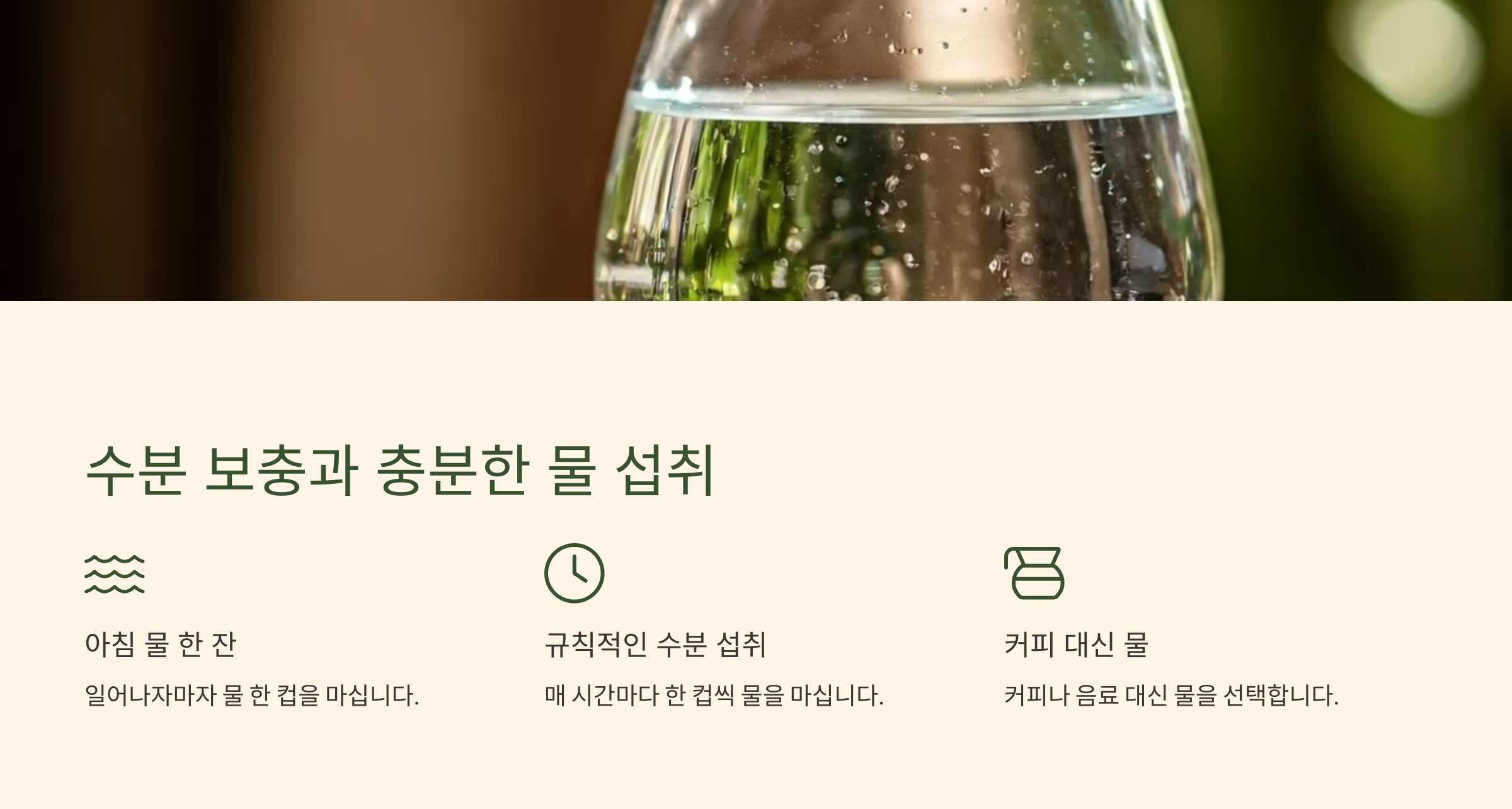 두통의 주요 원인 중 하나는 탈수이므로, 하루 동안 충분한 물을 마시는 것이 중요합니다. 물을 마셔 혈액을 묽게 하고, 뇌로의 산소 공급이 원활하게 이루어지도록 돕습니다. 아침에 일어나자마자 물을 한 컵 마시고, 매 시간마다 한 컵씩 마시는 습관을 들여 보세요. 특히 커피나 음료 대신 물을 선택하는 것이 좋습니다.