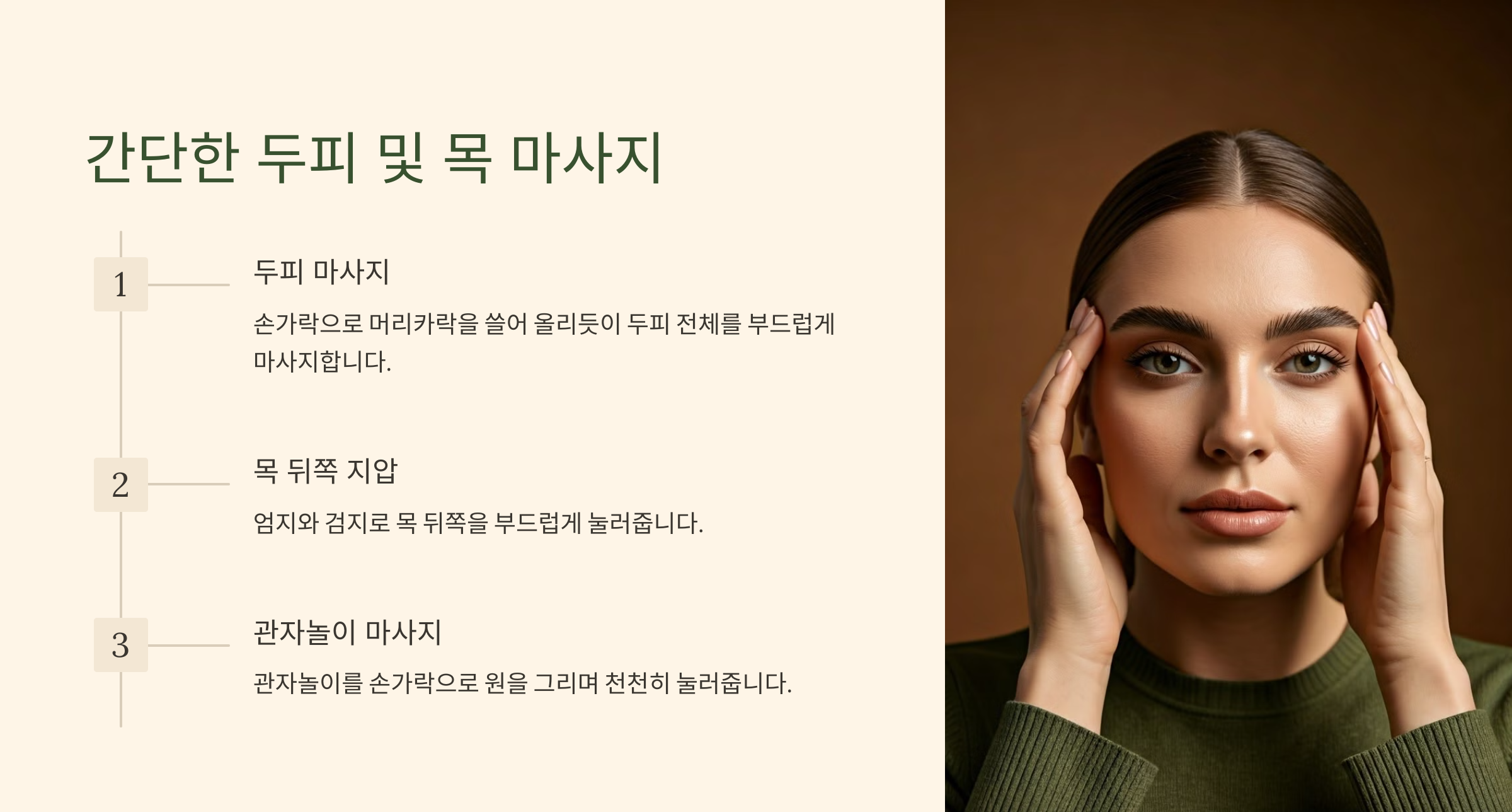 두피와 목 주변을 마사지하는 것은 근육을 풀어주고 혈액 순환을 개선하여 두통 완화에 도움을 줍니다. 다음과 같은 간단한 마사지 동작을 시도해 보세요:
