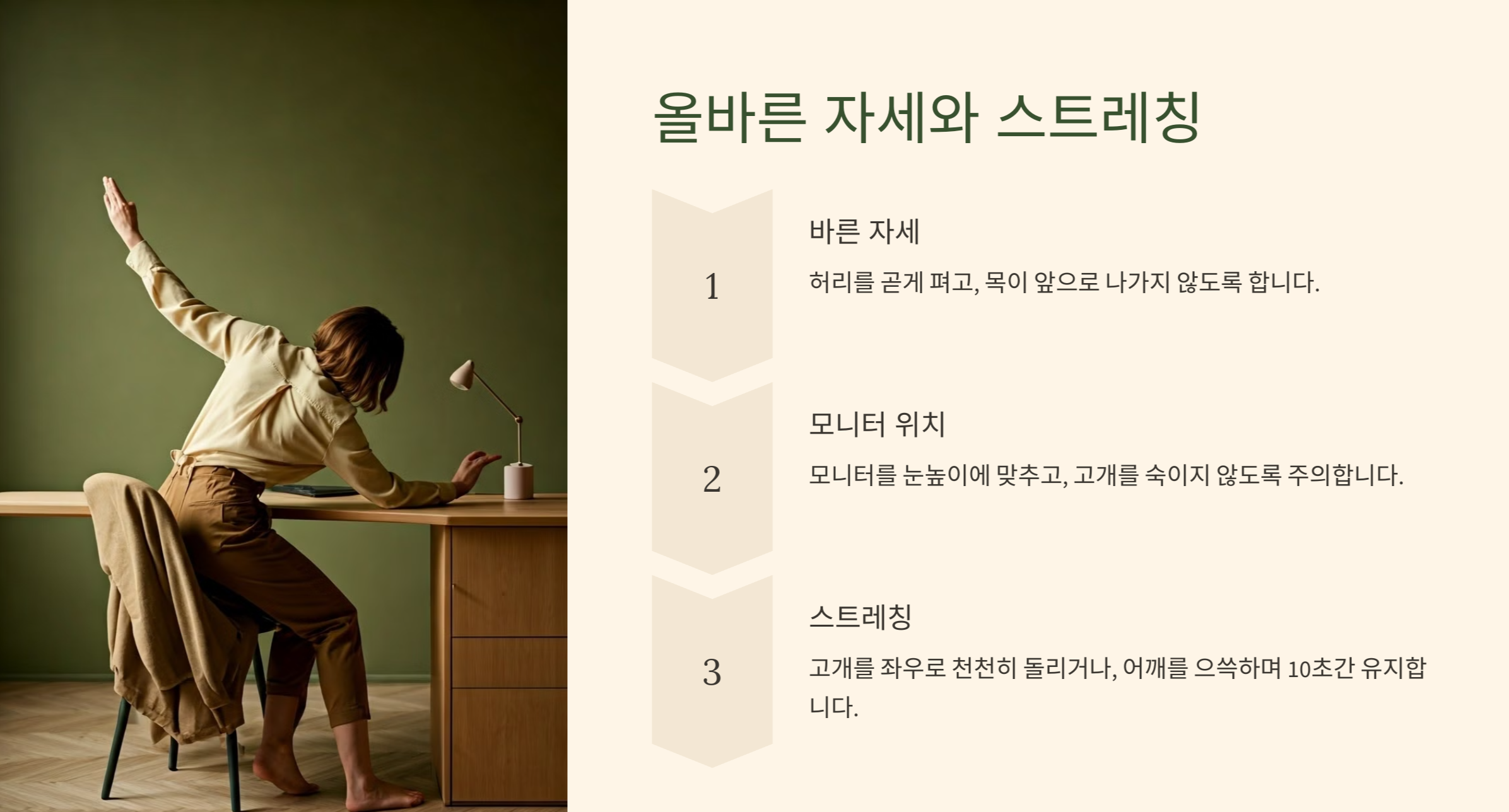 • 바른 자세: 앉을 때는 허리를 곧게 펴고, 목이 앞으로 나가지 않도록 합니다. 모니터를 눈높이에 맞추고, 고개를 숙이지 않도록 주의합니다.