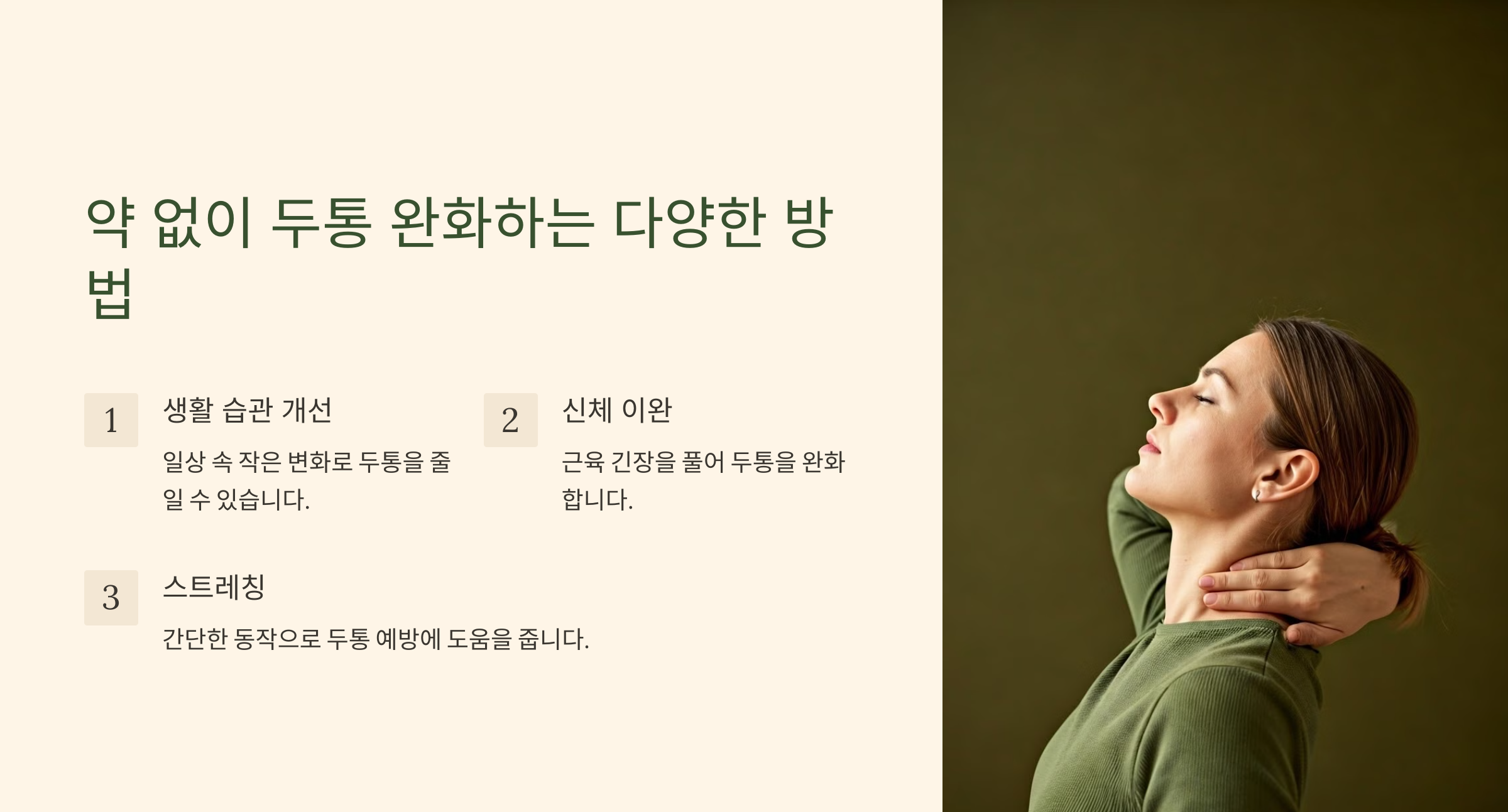 두통을 완화하는 방법은 생활 습관 개선부터 신체 이완, 스트레칭 등 다양합니다. 다음은 약을 쓰지 않고도 두통을 줄일 수 있는 실용적인 방법들입니다.