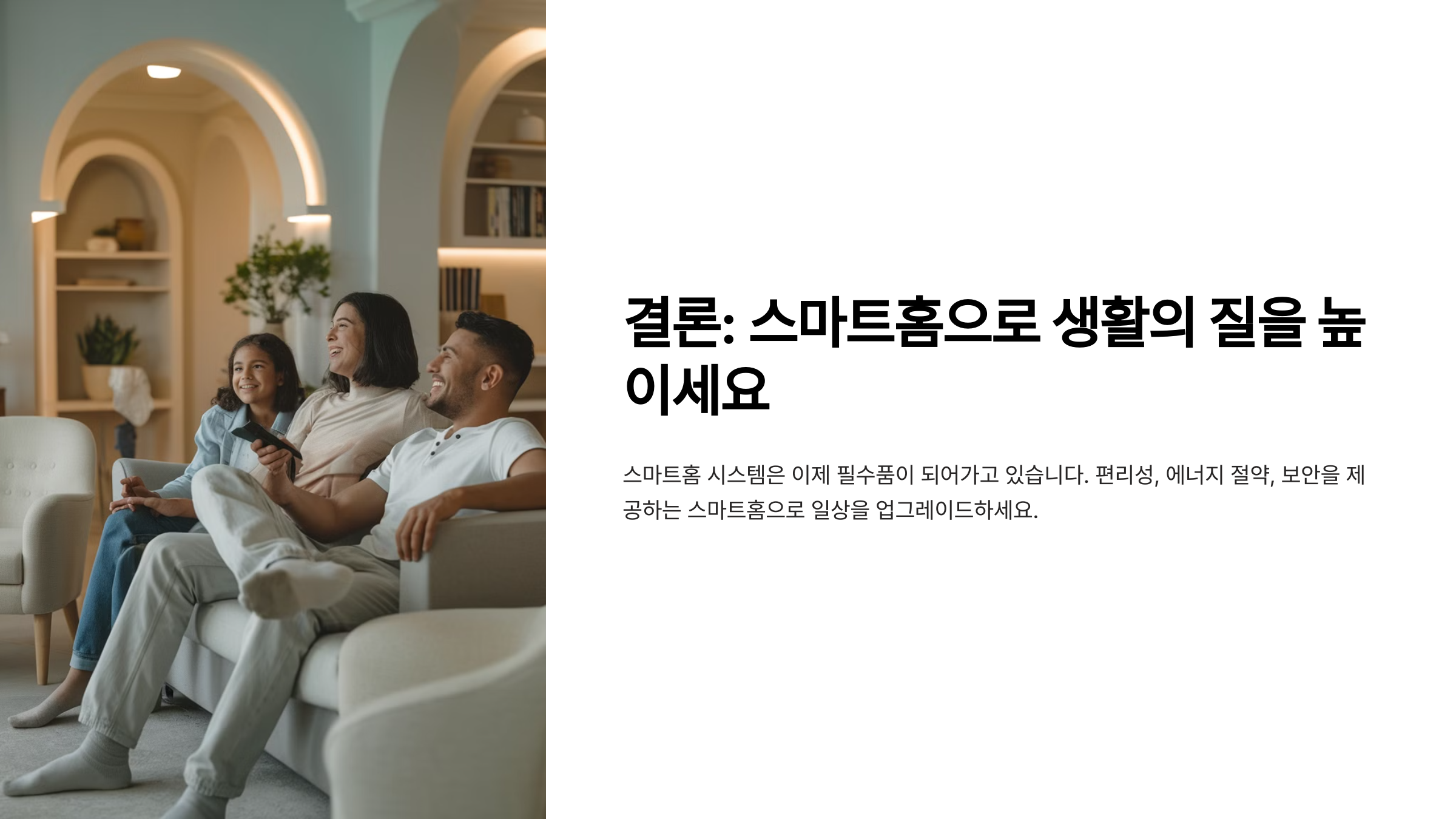 스마트홈 시스템은 이제 선택이 아닌 필수로 자리 잡고 있으며, 우리의 생활을 편리하고 안전하게 만들어줍니다. 단순한 자동화에서 벗어나 실질적인 에너지 절약과 보안을 제공하는 스마트홈은 앞으로 더욱 발전할 것입니다. 스마트홈 시스템을 도입해 일상을 업그레이드해 보세요!