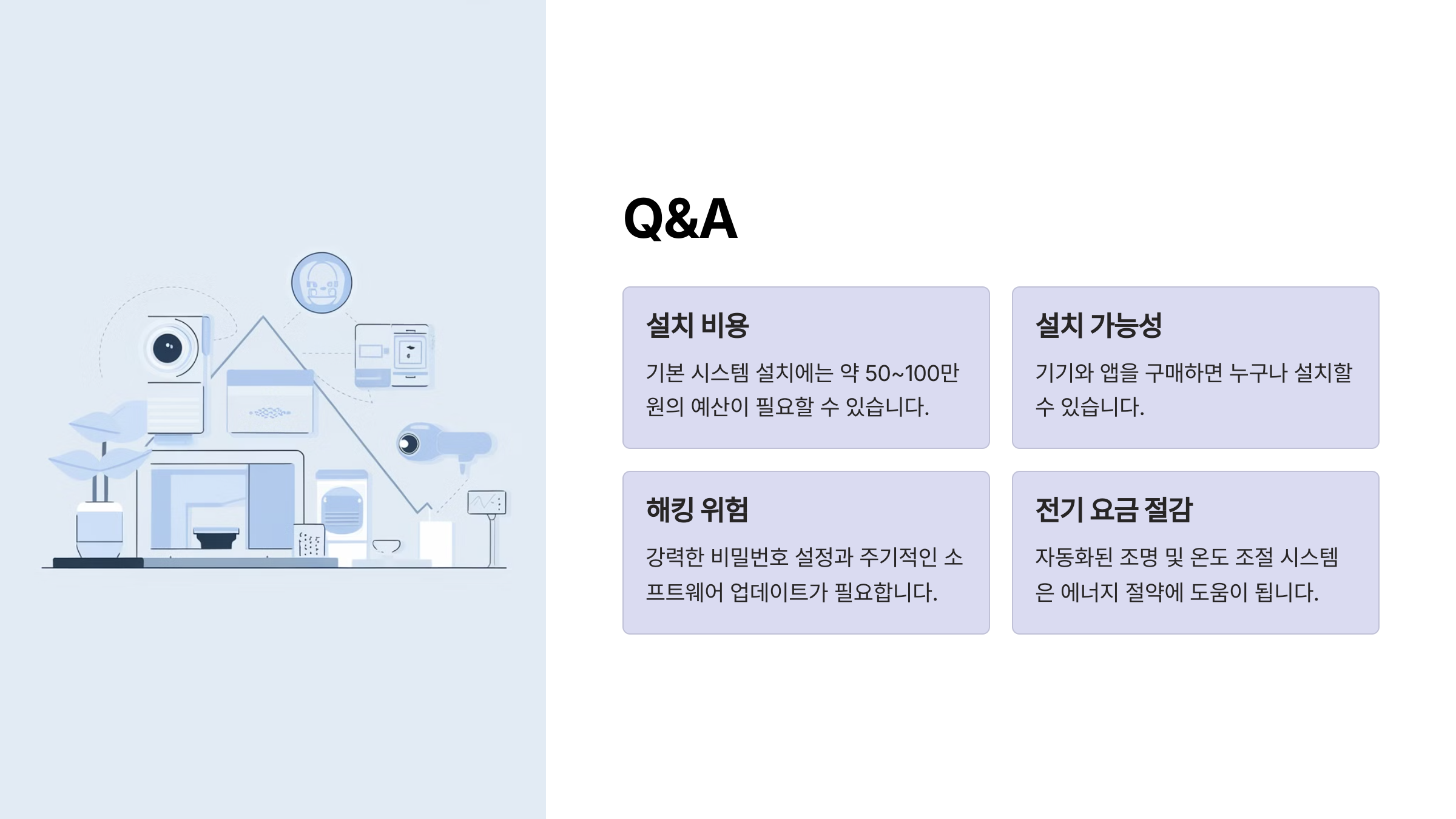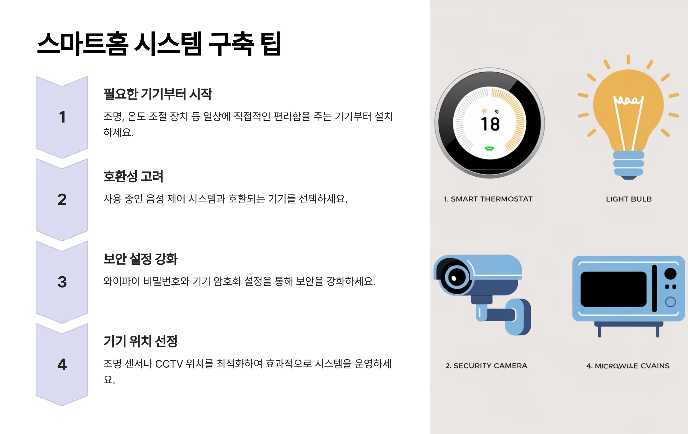- 필요한 기기부터 시작하기: 조명, 온도 조절 장치 등 일상에 직접적인 편리함을 주는 기기부터 설치해 보는 것이 좋습니다.