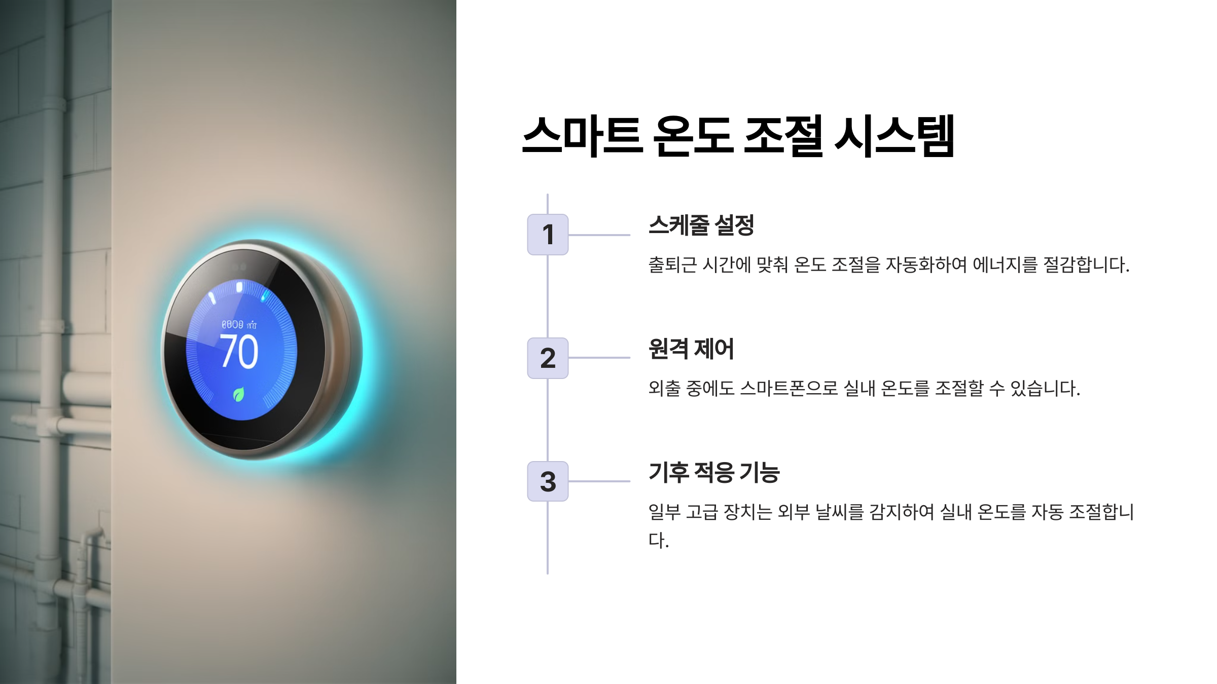 에너지 절약과 편안한 실내 환경을 동시에 잡을 수 있는 스마트 온도 조절 시스템입니다.