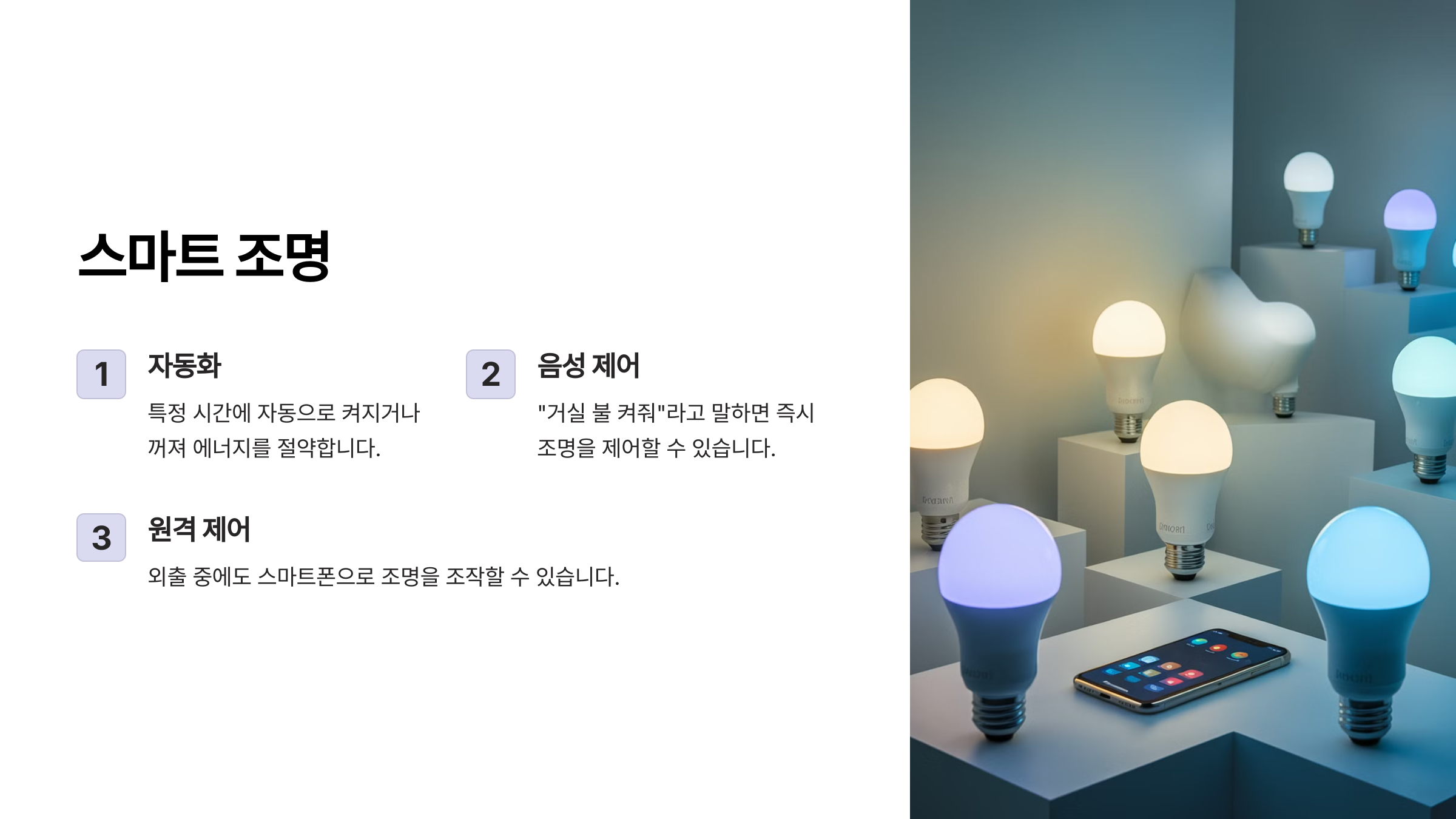 - 에너지 절약: 스마트 조명과 온도 조절 장치로 불필요한 에너지 소비를 줄일 수 있습니다.
