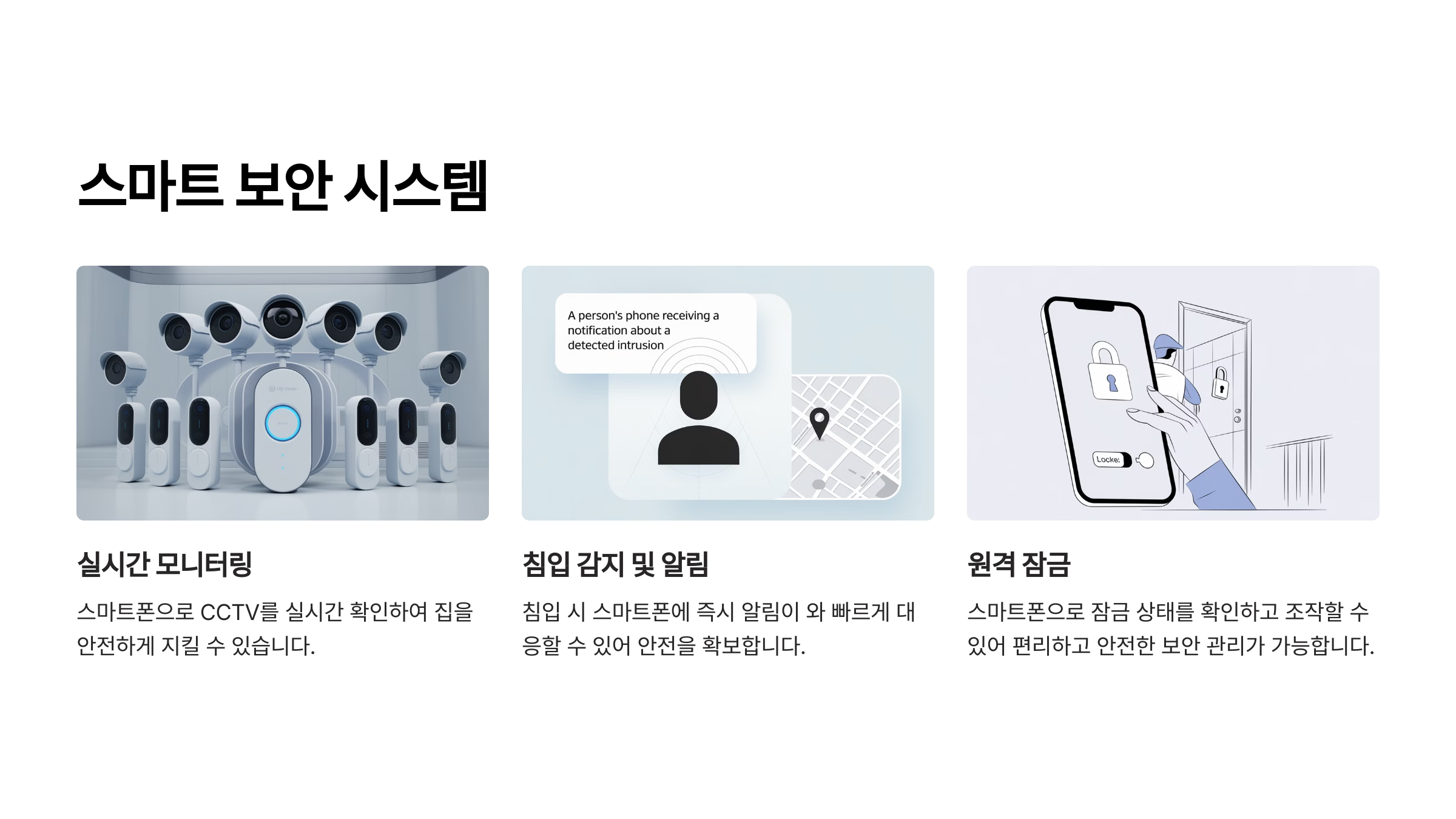 가정의 안전을 높이는 스마트 보안 시스템으로 언제 어디서나 집을 모니터링하고, 즉각적인 알림을 받을 수 있습니다.