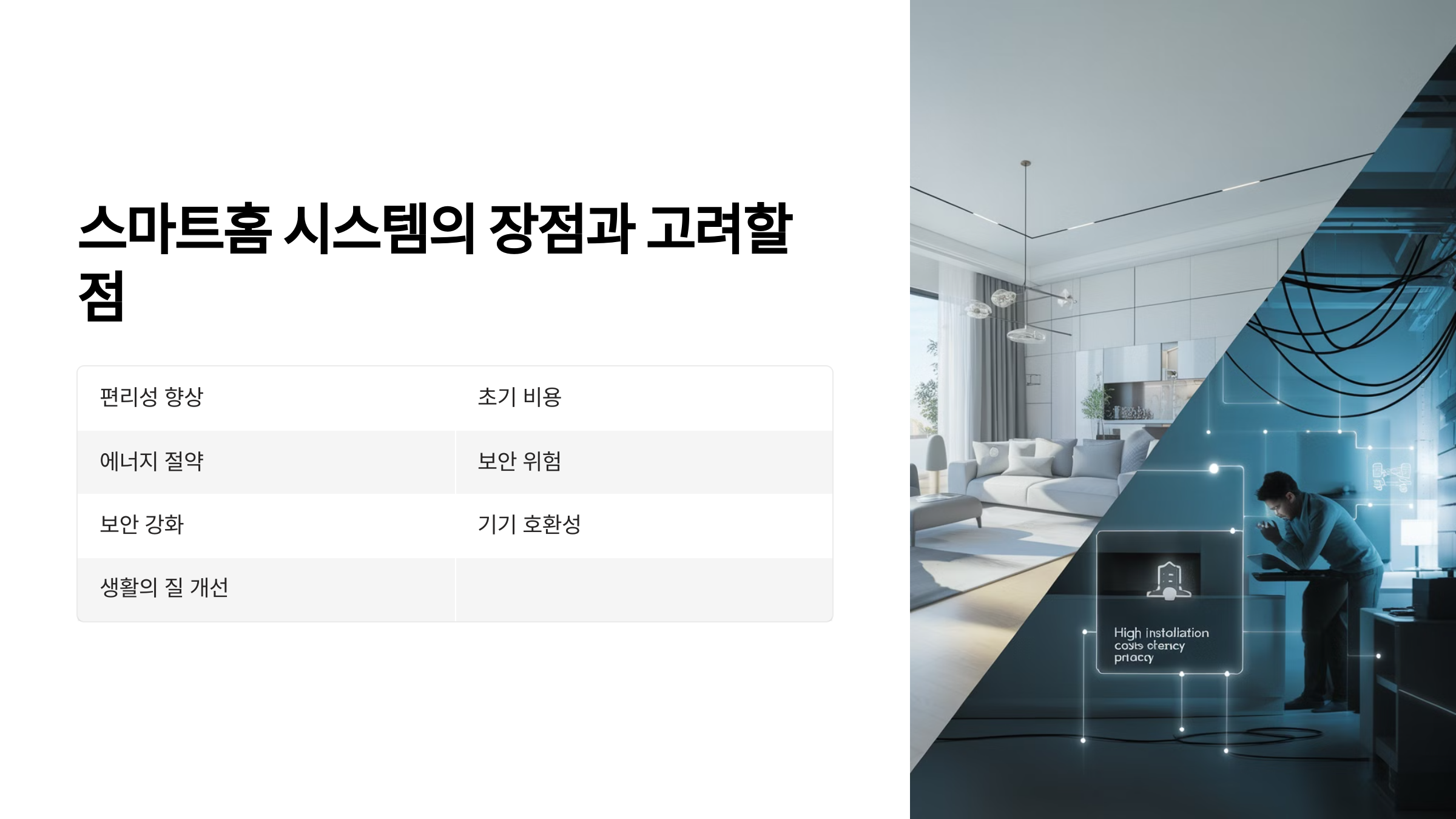 - 초기 비용: 스마트홈 시스템 구축에는 초기 비용이 많이 들어가므로 비용을 고려해야 합니다.