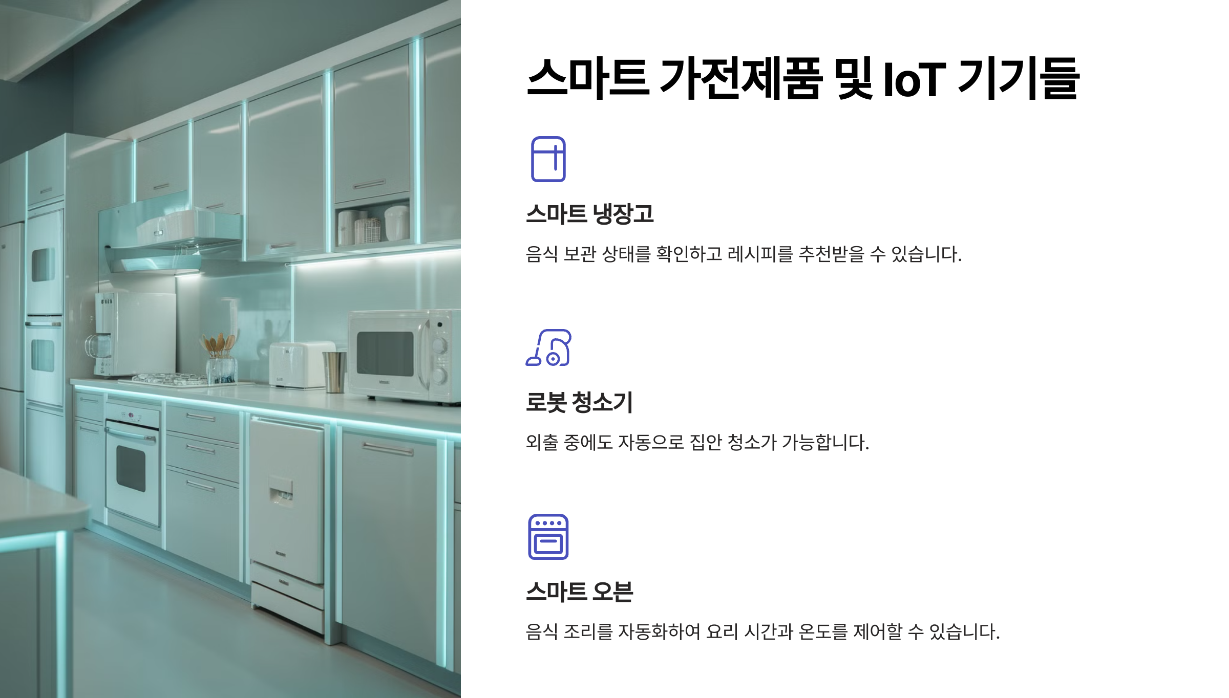 - 스마트 냉장고: 음식 보관 상태를 확인하거나 레시피를 추천받을 수 있습니다.