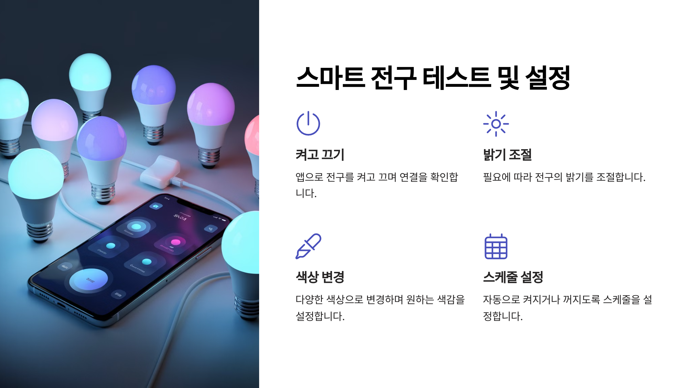 앱에서 전구 연결이 완료되면 테스트와 세부 설정을 통해 편리한 사용 환경을 만들 수 있습니다.