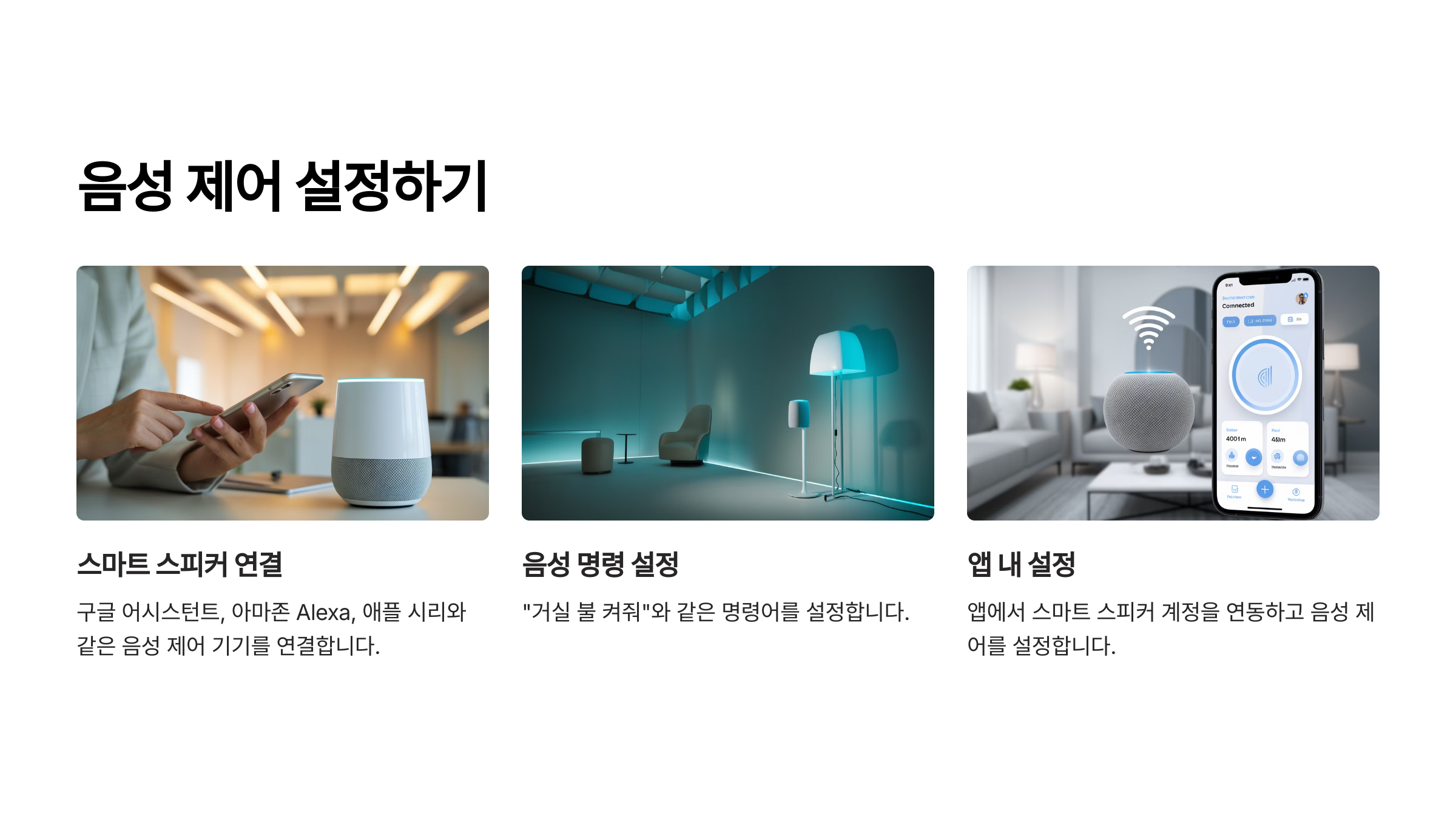 - 음성 명령 설정: "거실 불 켜줘" 또는 "침실 불 꺼줘"와 같은 명령어를 설정합니다.