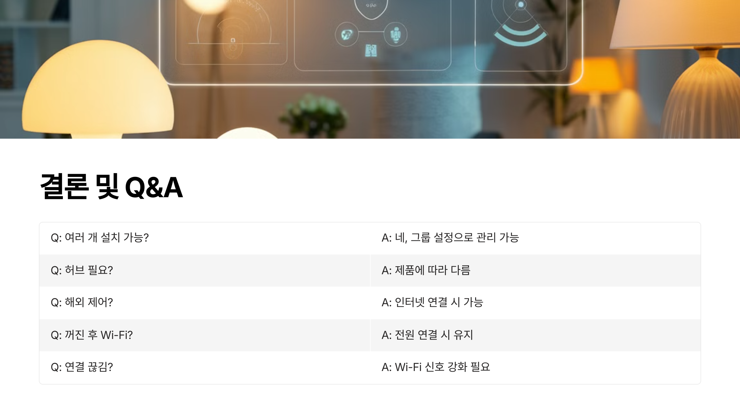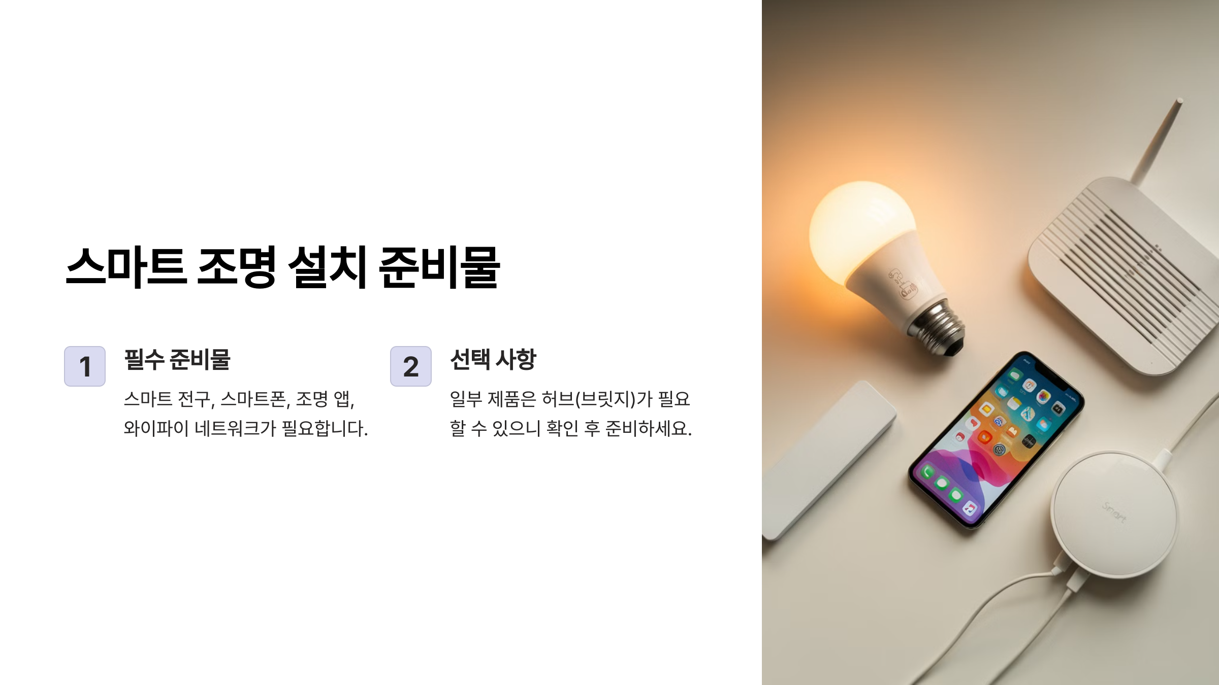 - 허브(필요 시): 일부 스마트 전구는 Wi-Fi 연결 대신 허브(브릿지)가 필요합니다. 허브가 필요한 제품인지 확인 후 준비합니다.