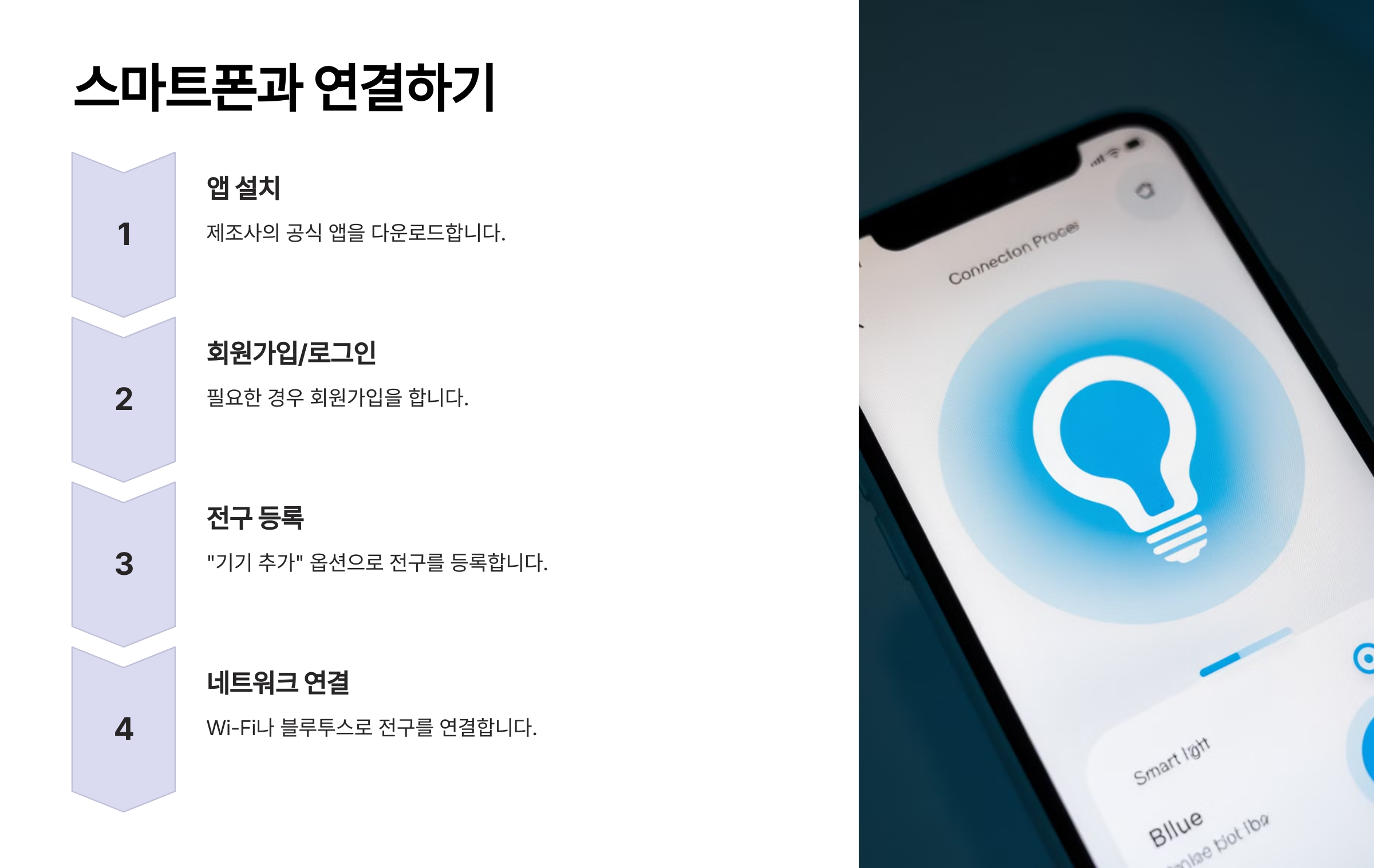 - 앱 설치: 스마트 전구 제조사의 공식 앱을 다운로드합니다. (예: 필립스 Hue 앱, TP-Link Kasa 등)