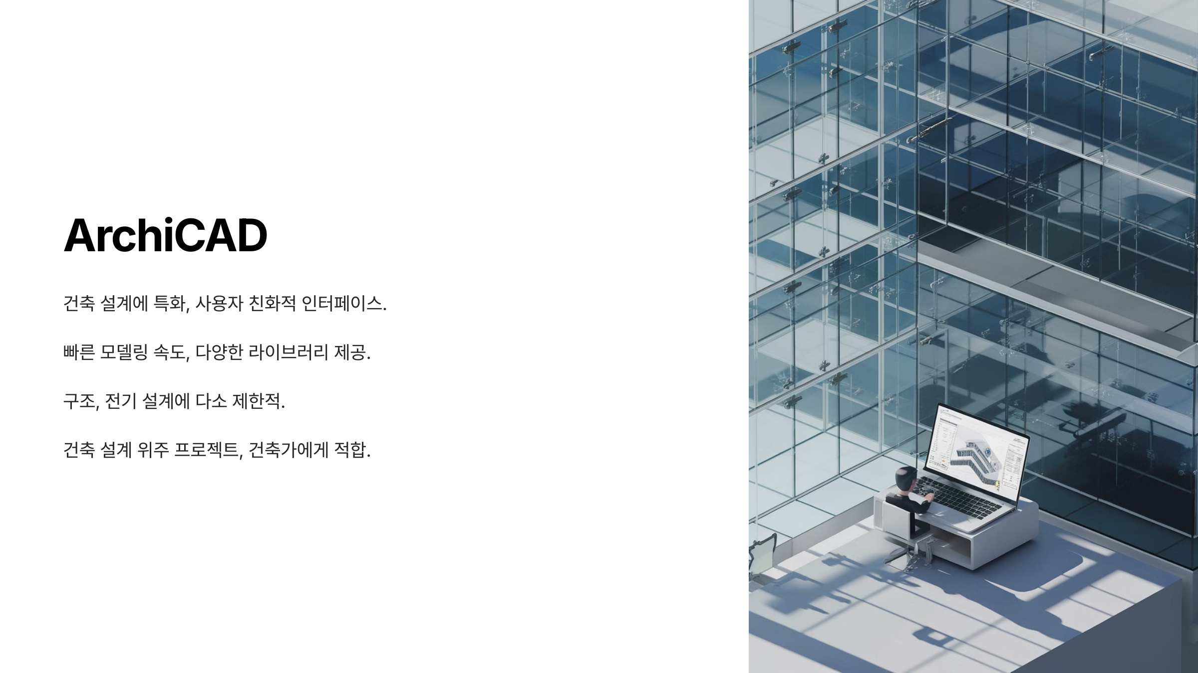 ArchiCAD는 Graphisoft에서 개발한 BIM 소프트웨어로, 특히 건축 설계에 특화되어 있어 건축가들에게 인기가 많습니다. 사용자 친화적인 인터페이스와 빠른 모델링 속도 덕분에 소규모부터 대규모 프로젝트까지 효율적으로 작업할 수 있습니다.