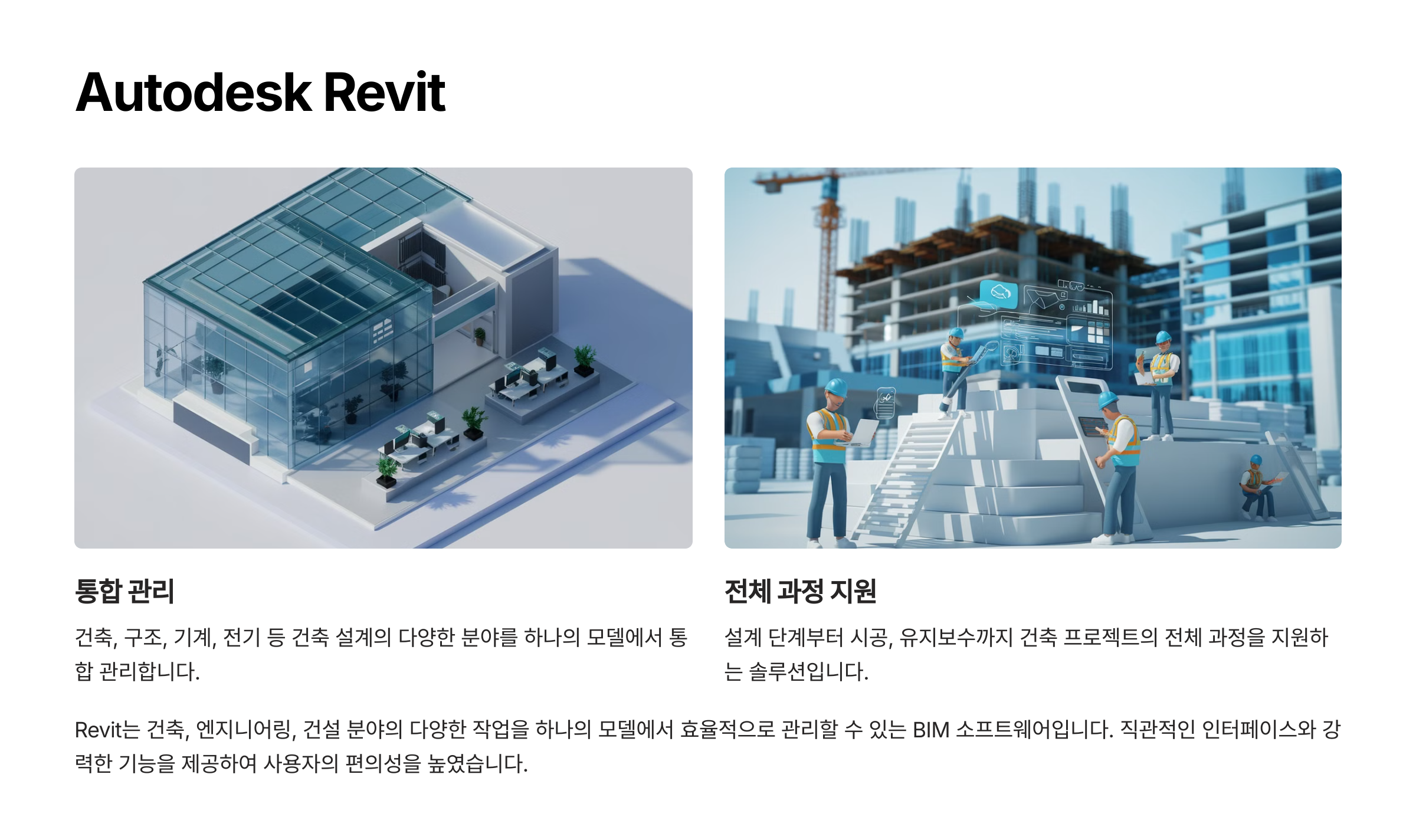 - 주요 기능: 3D 모델링, 문서 관리, 일정 관리, MEP(기계, 전기, 배관) 설계