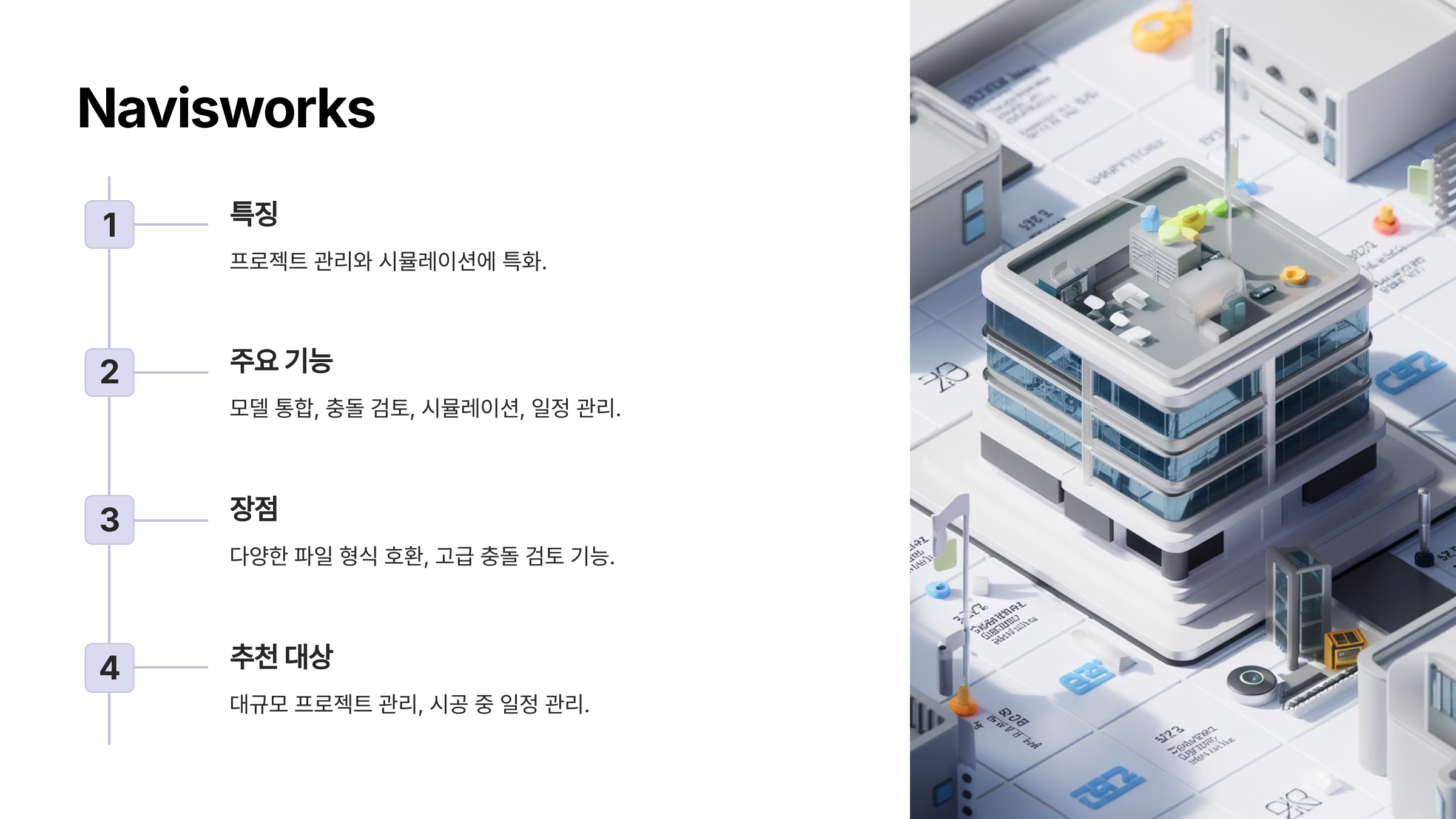 - 주요 기능: 모델 통합, 충돌 검토, 시뮬레이션, 일정 관리