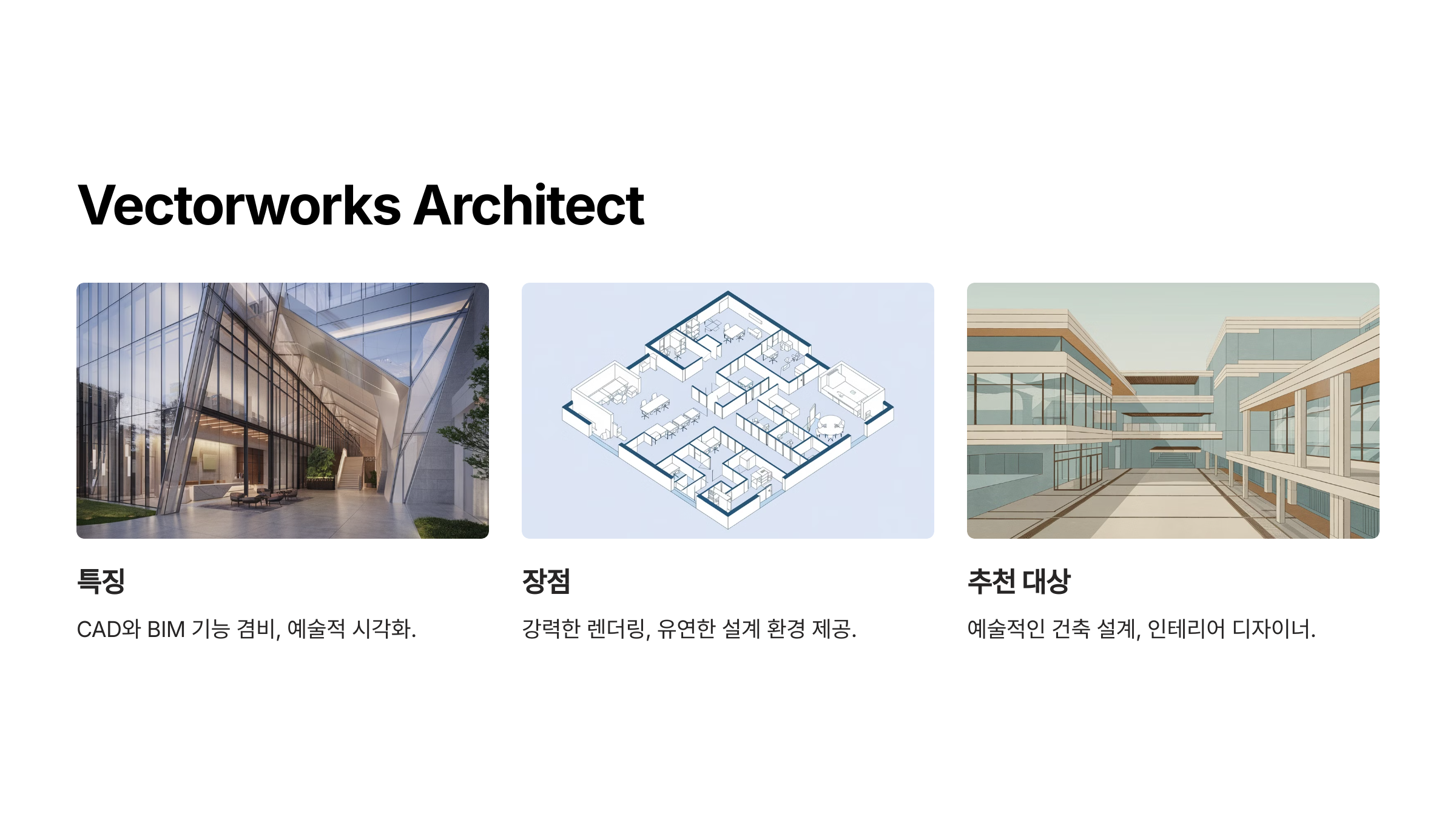 Vectorworks Architect는 CAD와 BIM 기능을 겸비한 소프트웨어로, 건축 설계와 예술적인 시각화가 주요 장점입니다. 고유한 렌더링 기능과 자유로운 디자인 작업 환경을 제공해 창의적인 프로젝트에 특히 유리합니다.