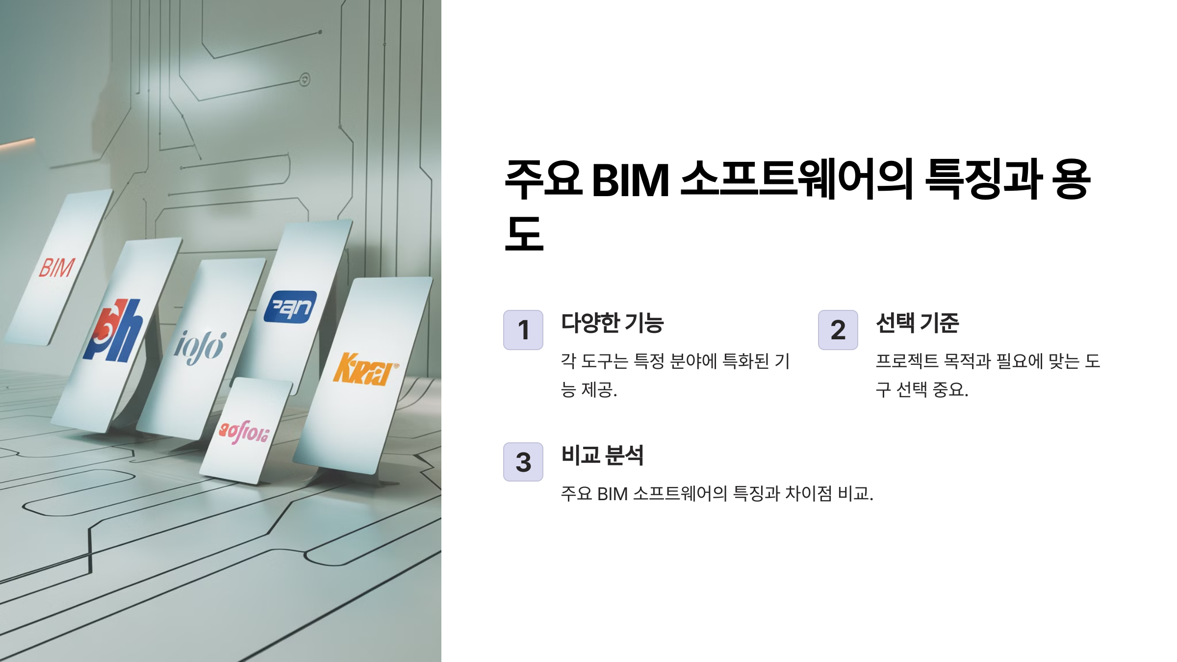 BIM(Building Information Modeling) 도입 시 가장 중요한 요소 중 하나는 적합한 소프트웨어 선택입니다. BIM 소프트웨어는 다양한 기능과 목적에 따라 선택의 폭이 넓고, 각 도구는 특정 분야에 특화된 기능을 제공합니다. 이번 글에서는 주요 BIM 소프트웨어들의 특징과 차이점을 비교하여, 여러분이 프로젝트 목적과 필요에 맞는 도구를 선택할 수 있도록 도와드리겠습니다.
