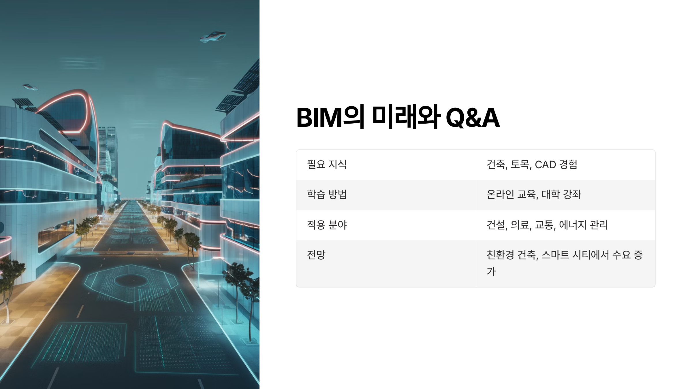A5. BIM 엔지니어링은 기술적 발전과 함께 수요가 증가하고 있으며, 특히 친환경 건축, 스마트 시티, 인프라 유지보수 분야에서 그 전망이 매우 밝습니다.