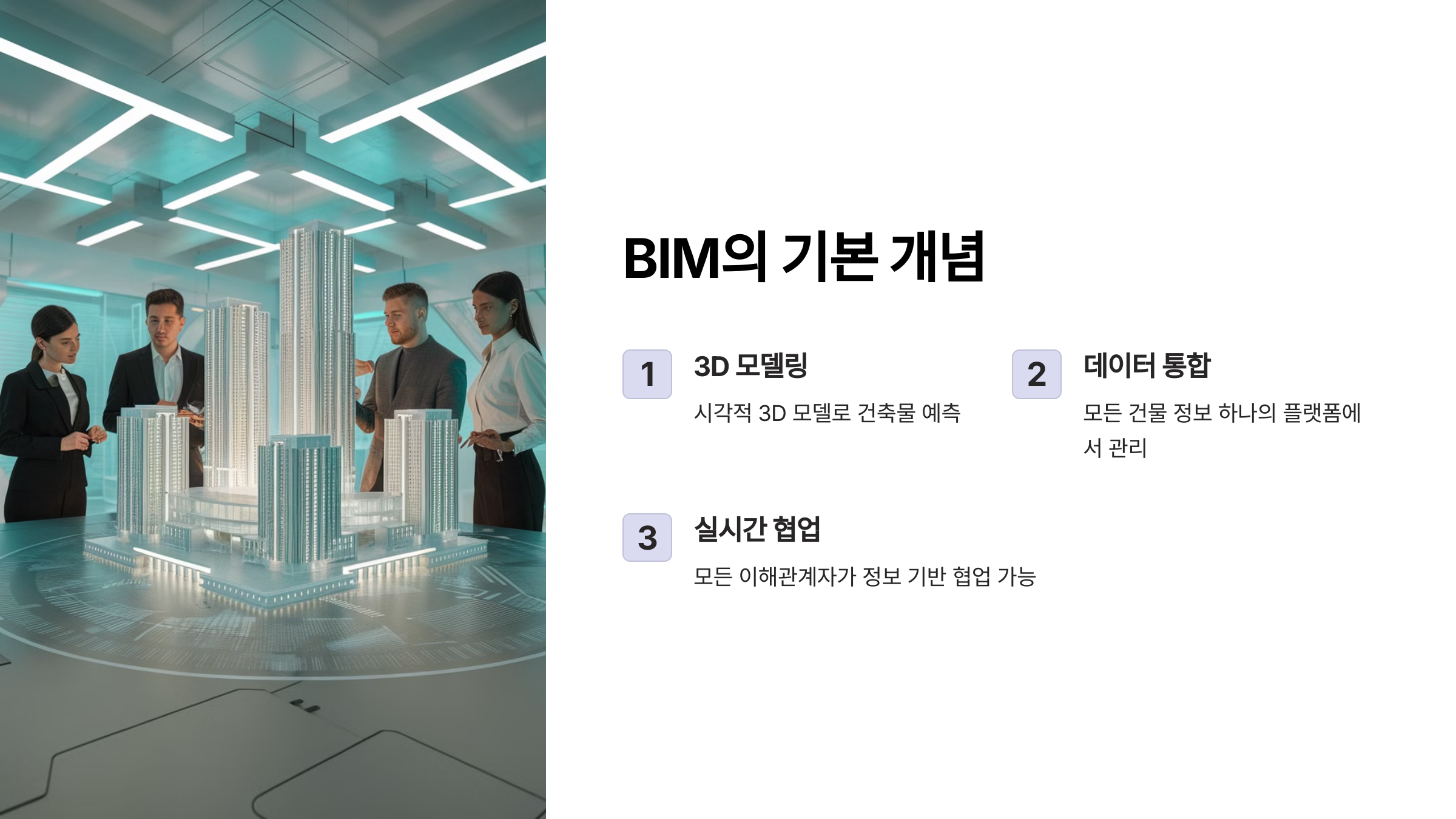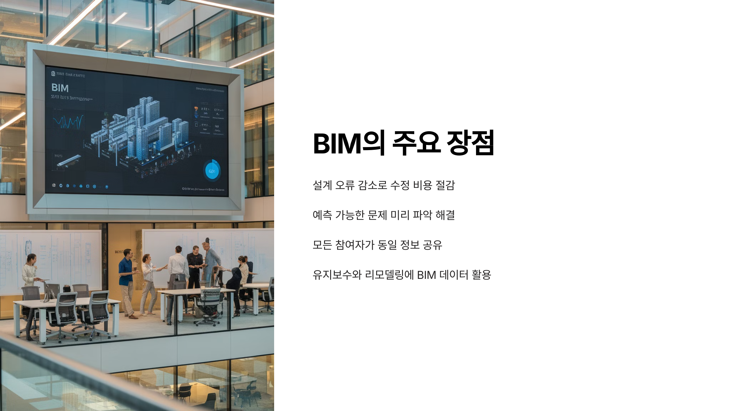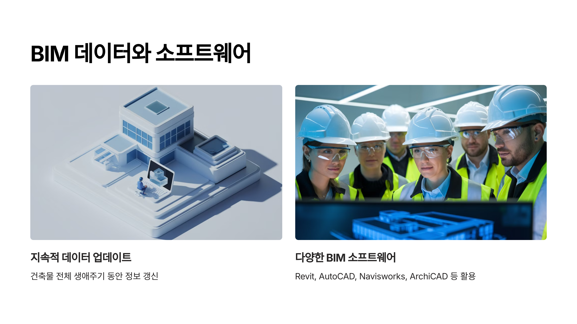 - 효율적 협업: 건축, 설계, 시공, 유지보수 등 모든 참여자가 동일한 정보를 공유하므로 커뮤니케이션 오류를 최소화할 수 있습니다.