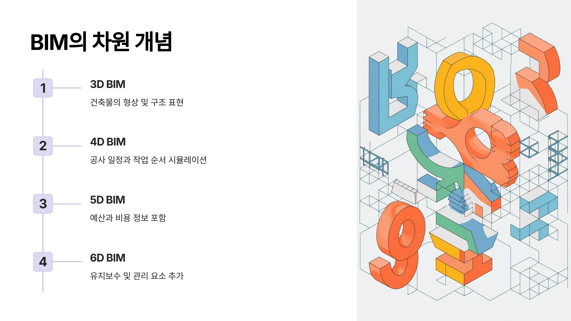 BIM은 3D 모델링에서 더 나아가 시간과 비용을 포함한 '차원' 개념으로 확장됩니다: