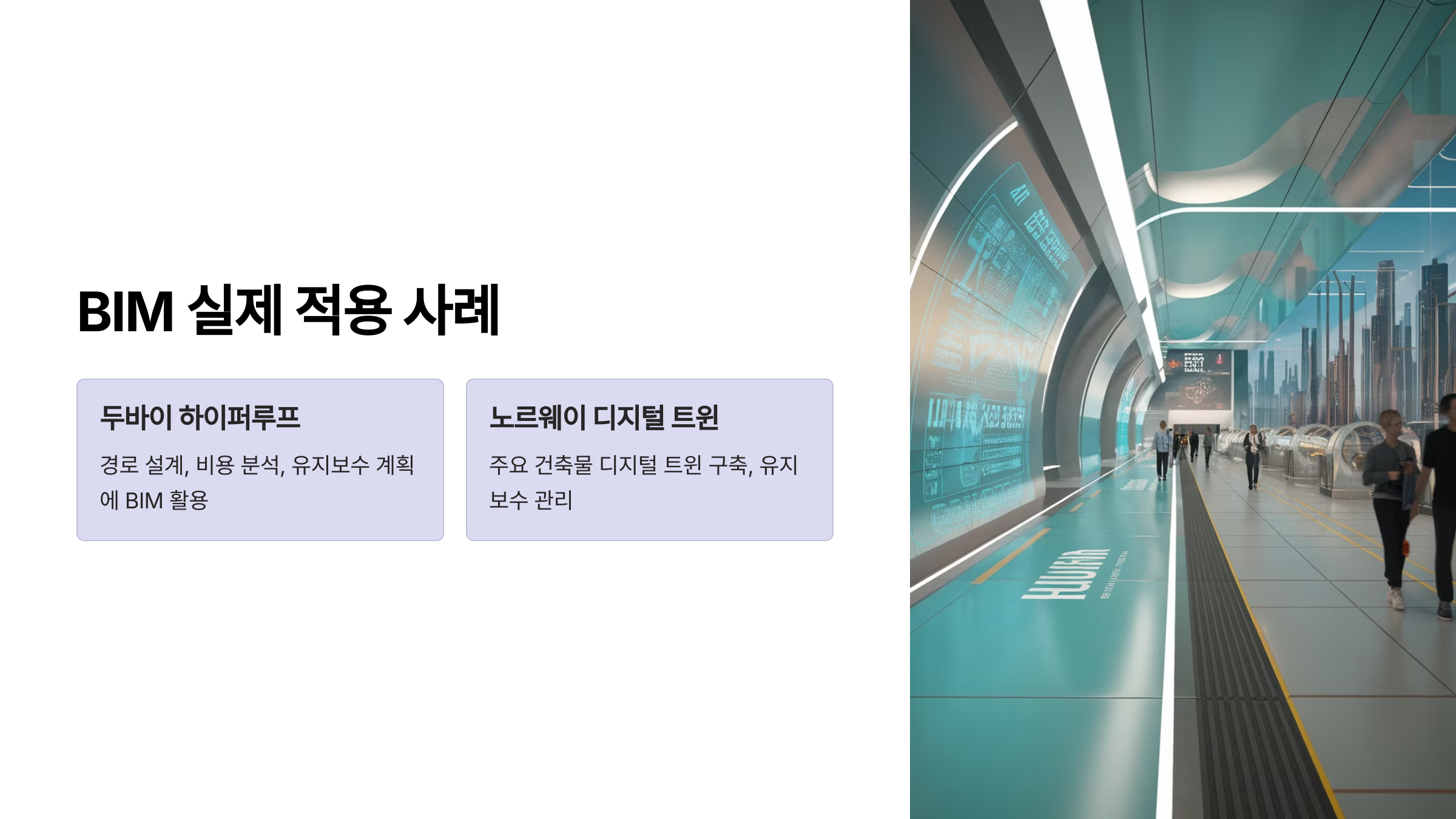 두바이 하이퍼루프 프로젝트는 BIM을 활용하여 전 세계적으로 관심을 끌었던 혁신적인 프로젝트입니다. 고속 이동 수단을 위한 경로 설계, 비용 분석, 유지보수 계획까지 BIM을 통해 관리함으로써 안전성과 비용 효율성을 극대화했습니다.
